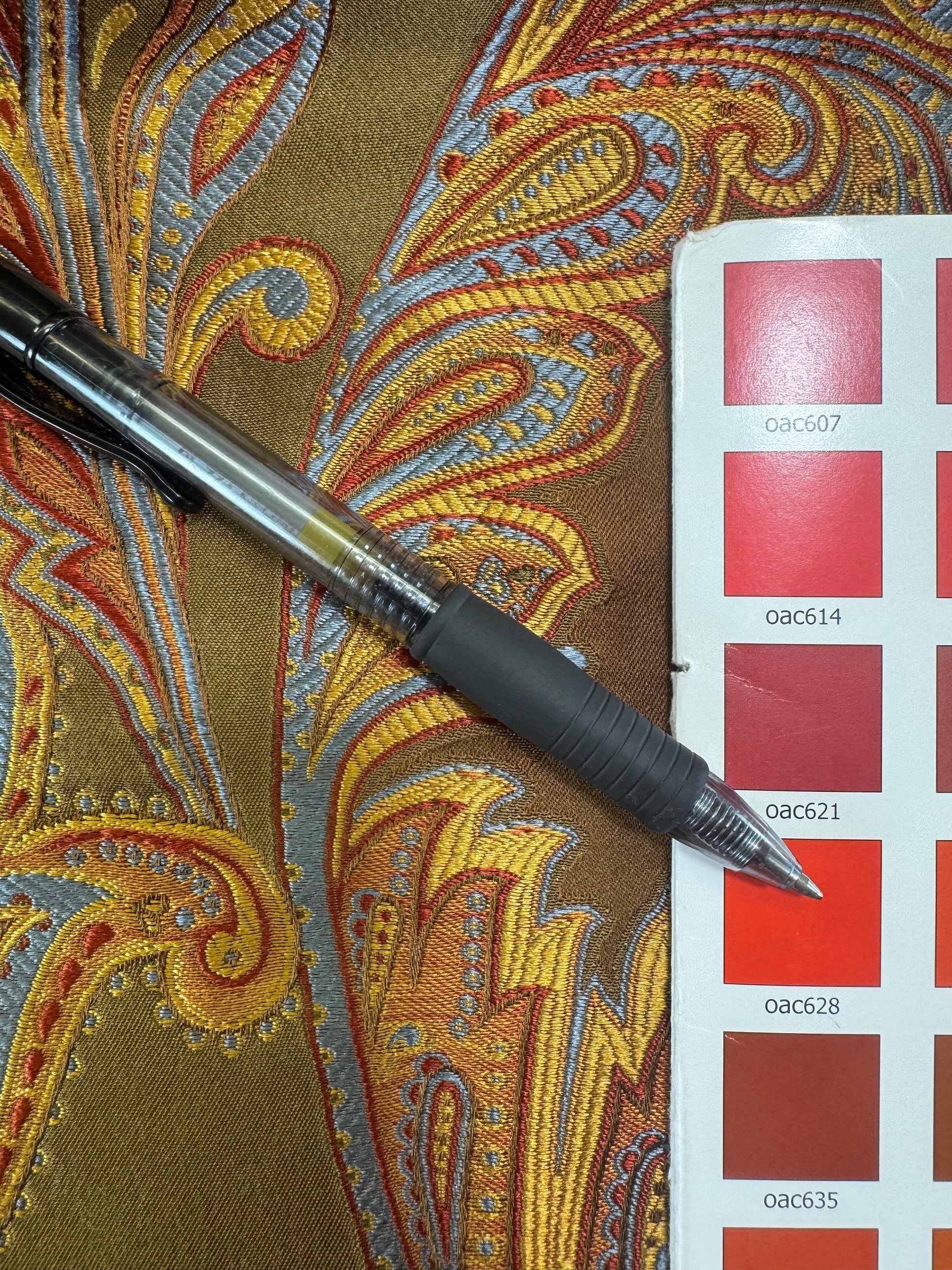 Salparino, a 100% silk lampas, is beyond lush. The moss and parrot colorways means hundreds of hues between mossy green, red, brilliant blue gold and brown. Heavy at 0.5lb/yard for silk, it can be used for drapery, upholstery and garment.