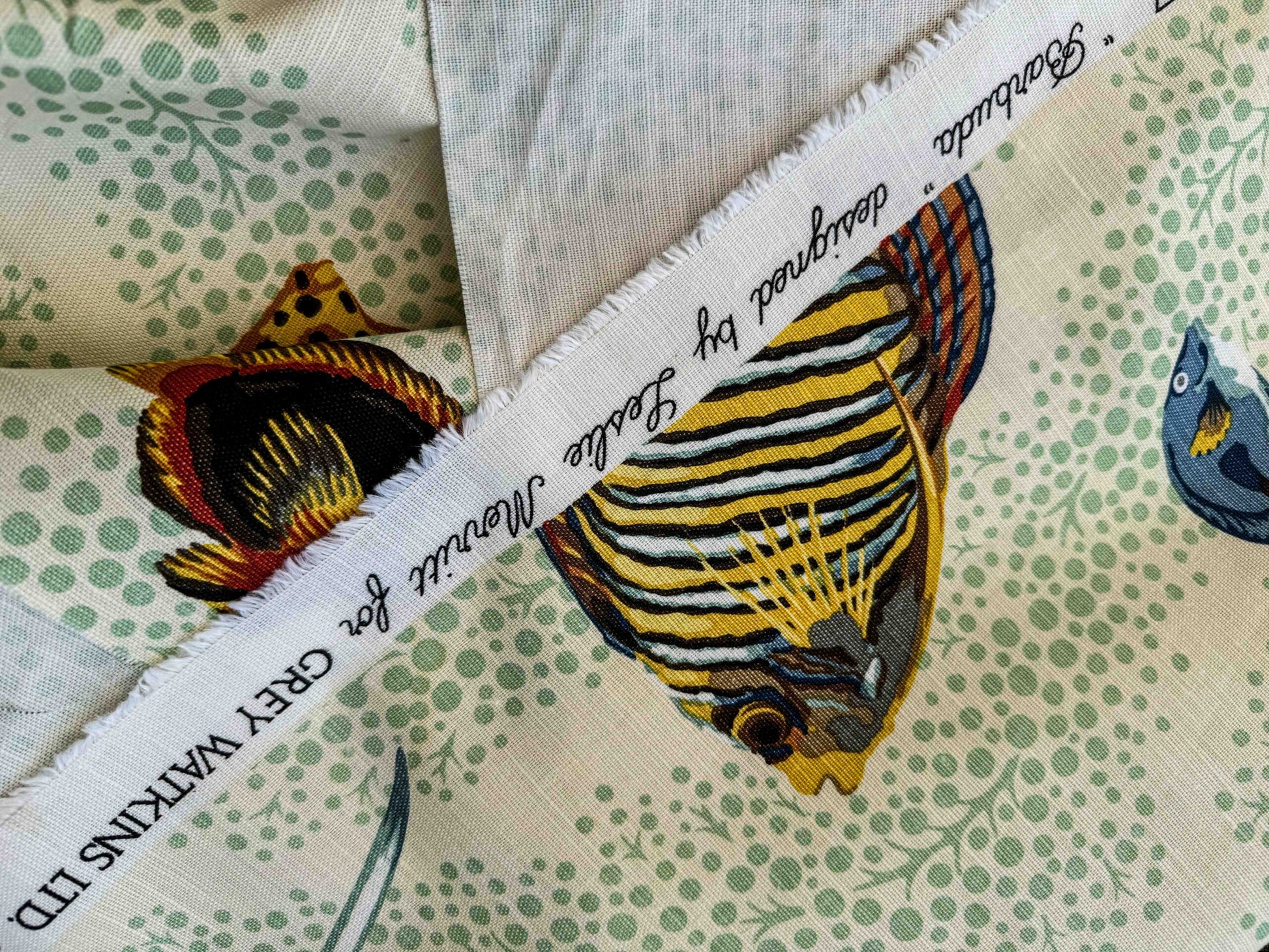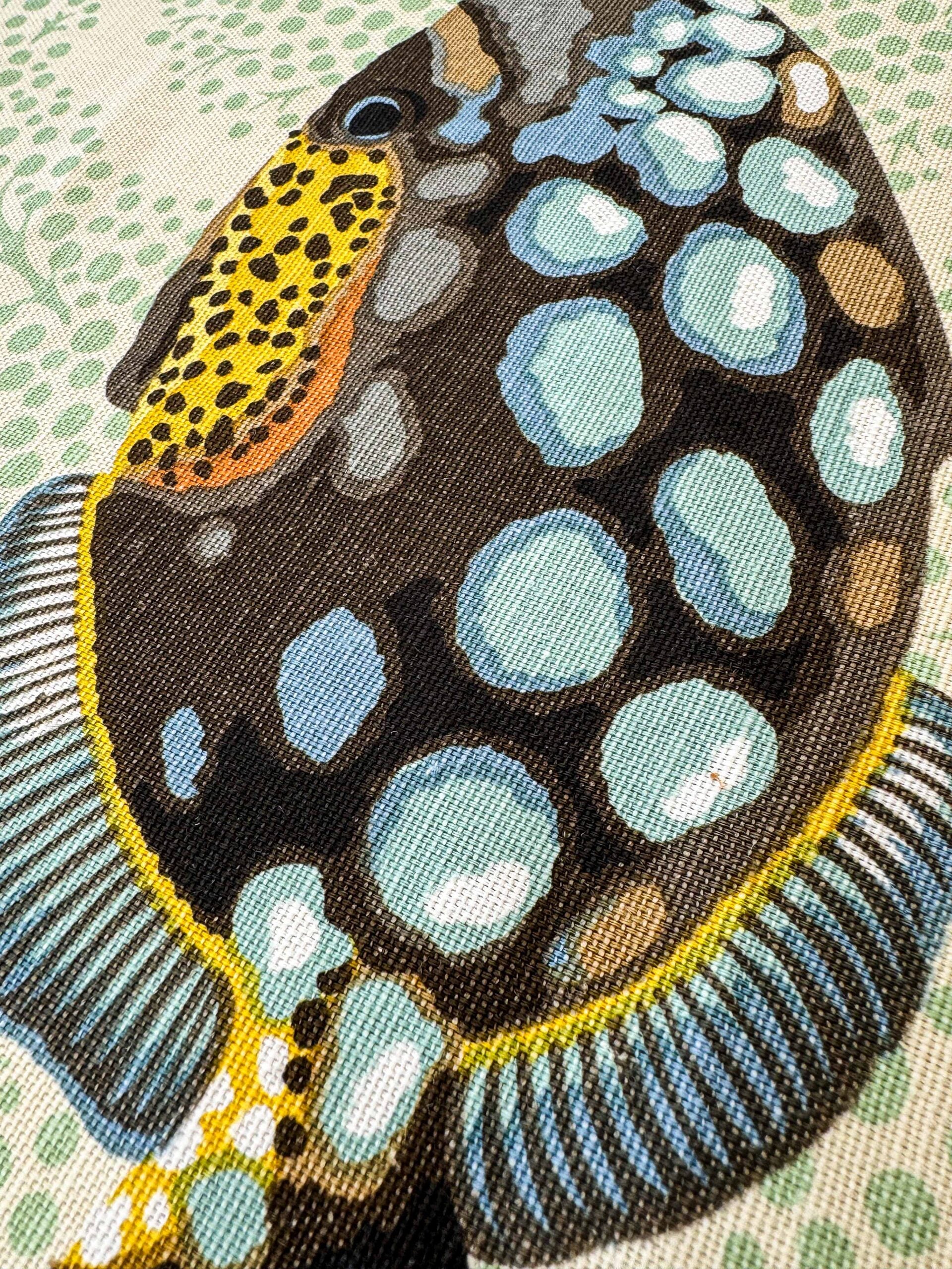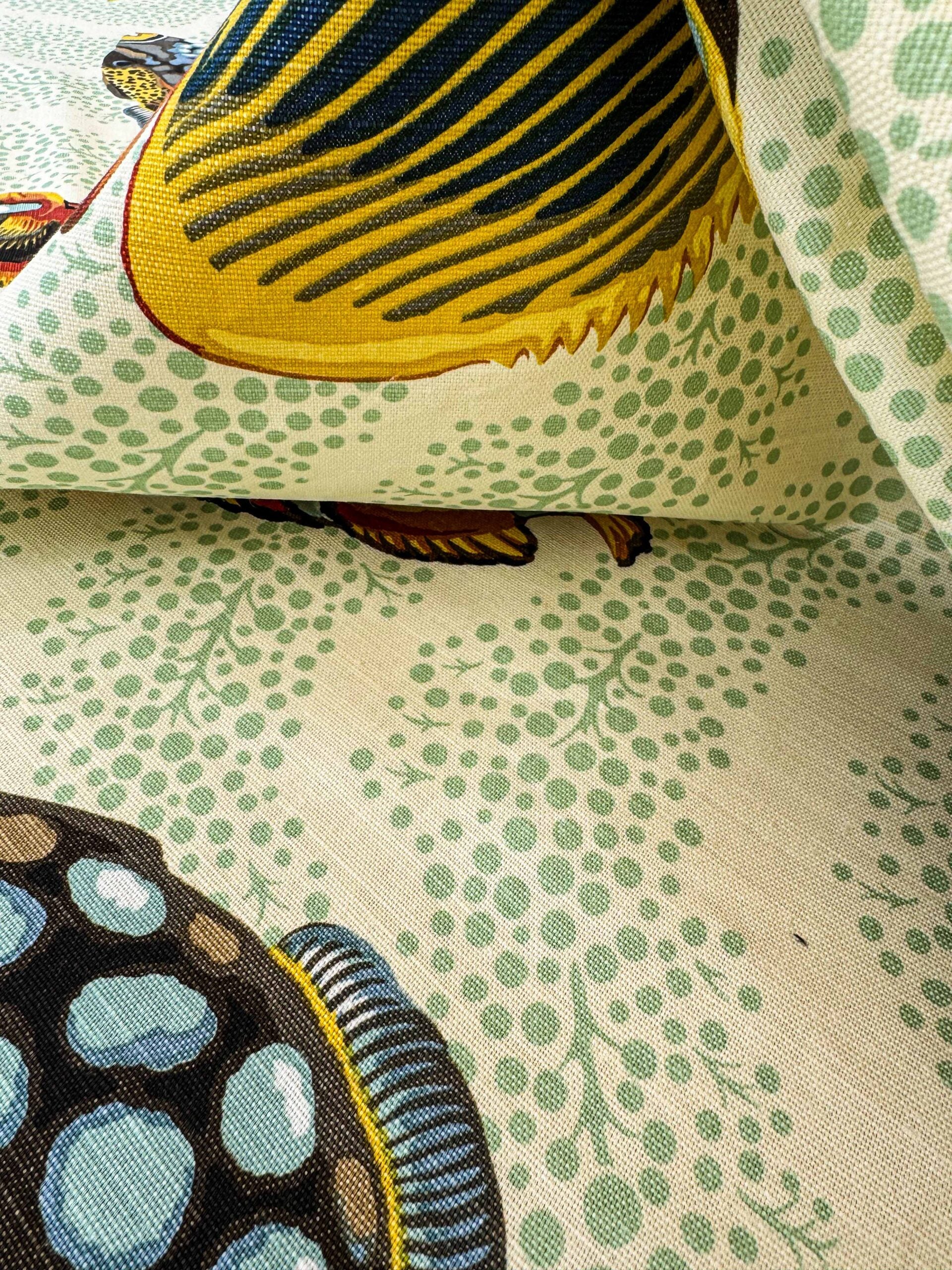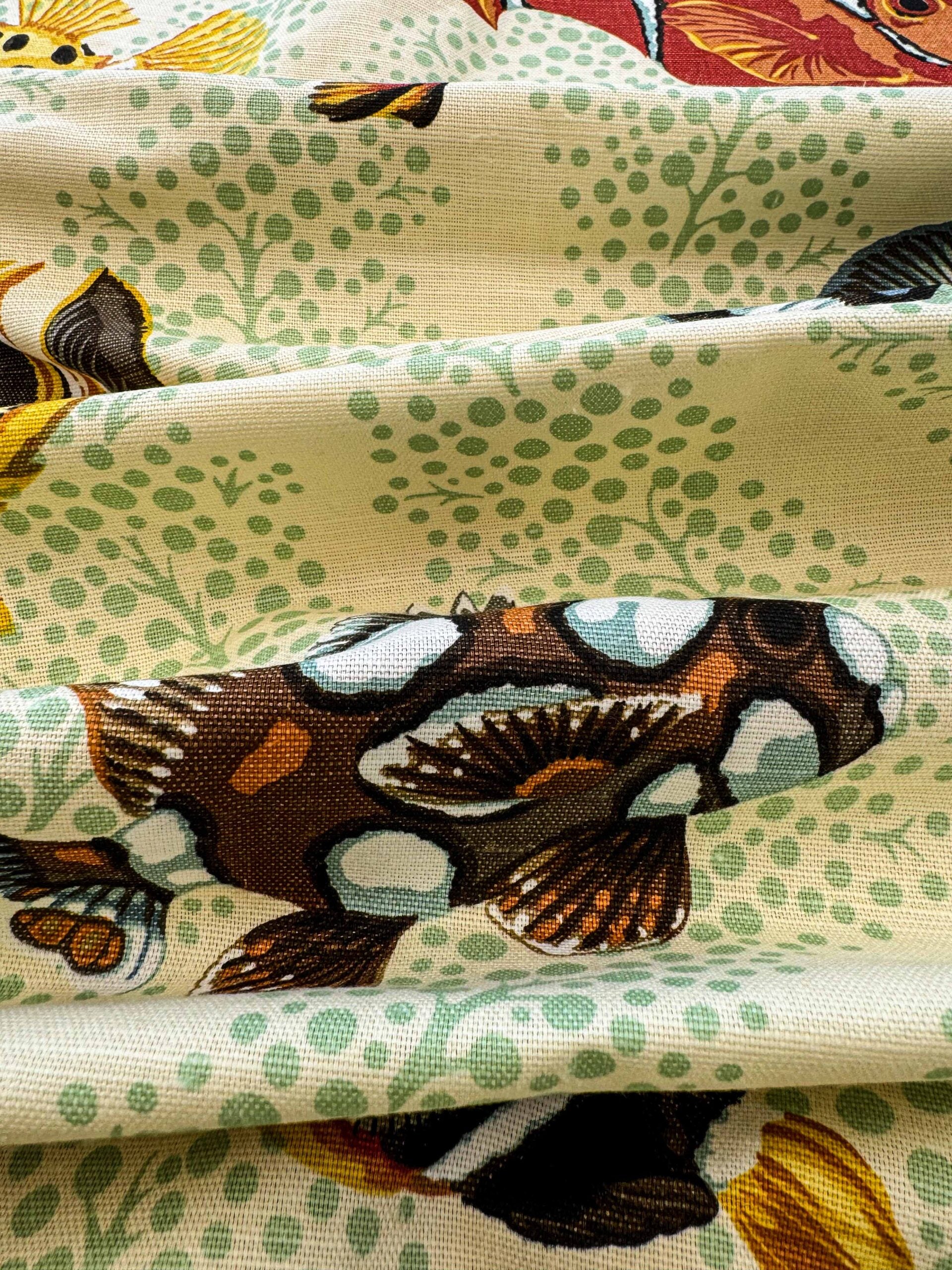 1.4 y Scalamandre Barbuda Coral/Apricot/Green Gold Dots Fish Nautical Ocean