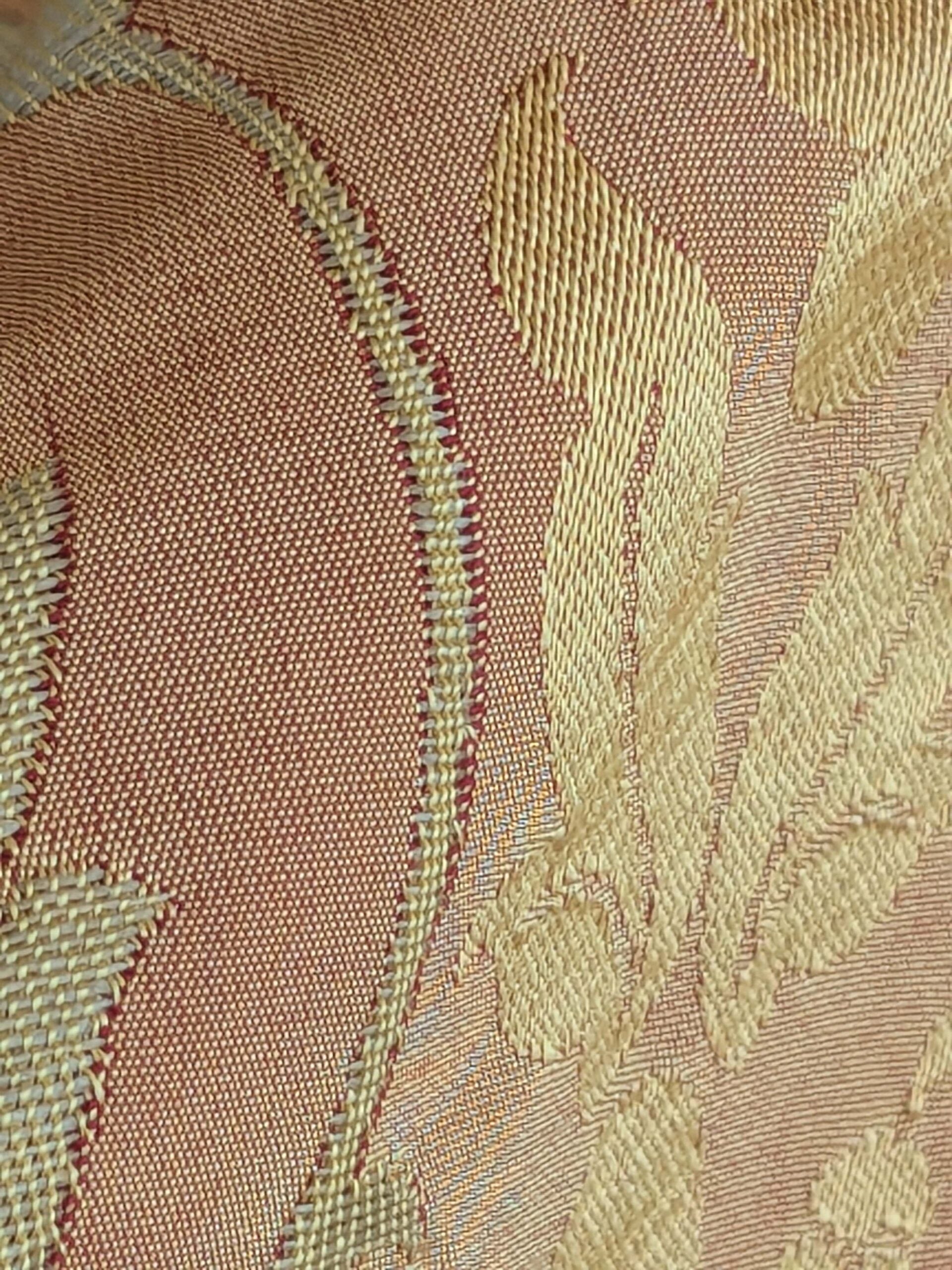 The founders of Old World Weavers started the business because they found many textiles simply were not available in US. Broche Damask must be one of those. Made in Italy, with accurate composition and graphic design, period correct fiber blend (silk, linen and cotton), Broche renders large blossoms into both medallion and stripes. Fully reversible, you are like getting 4 designs in one textile. The colors are delicious. Compared with most red and gold combo, Broche is more fruity (think apricot or peach and rose), subtle and light-hearted.