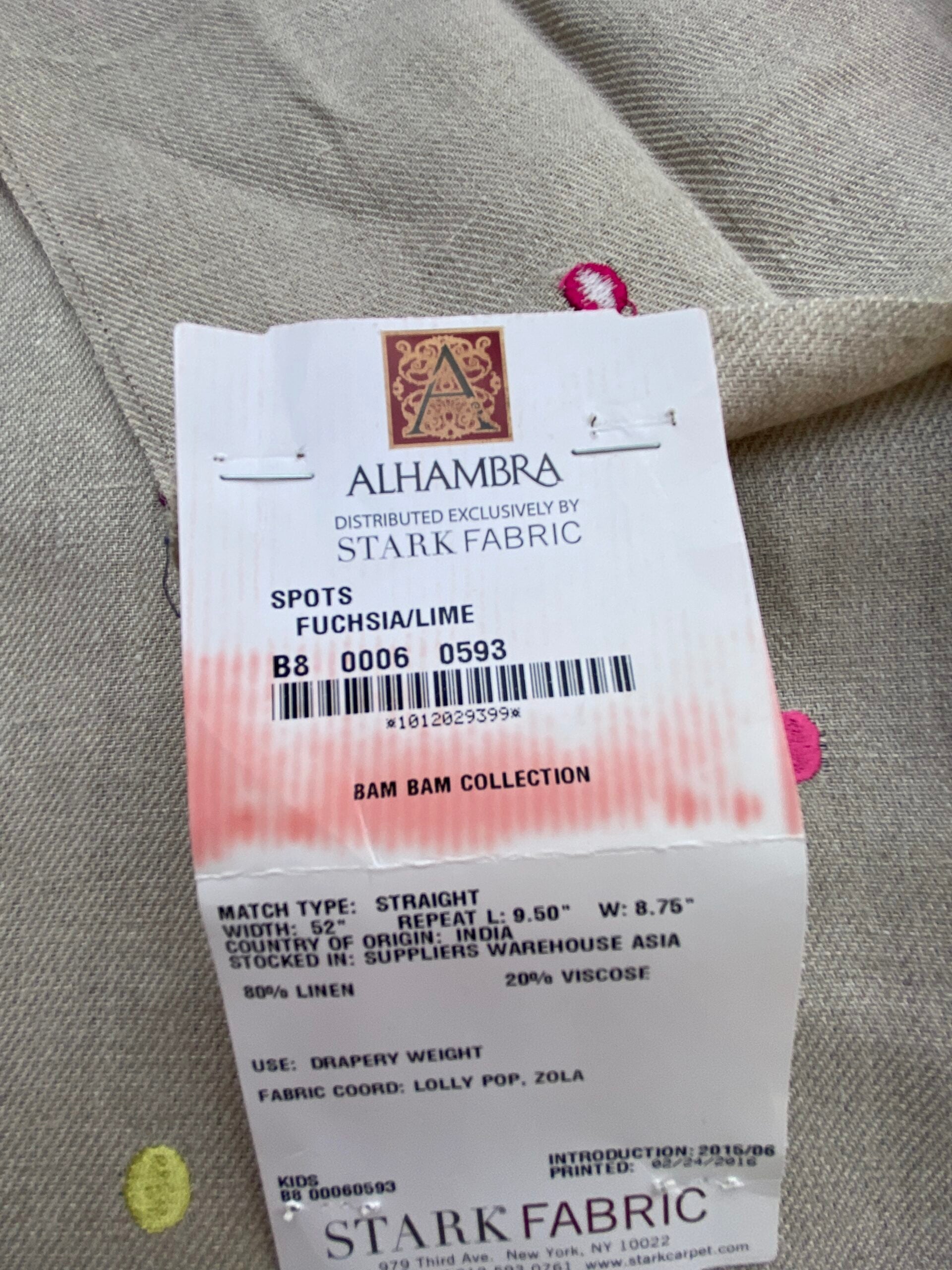 11 Berkbox75 Square Embroidery by Alhambra Spots Fuschia Lime MSRP USD Small Scale Kids Nursery 1.2yd x 26" MSRP USD 300+/Y