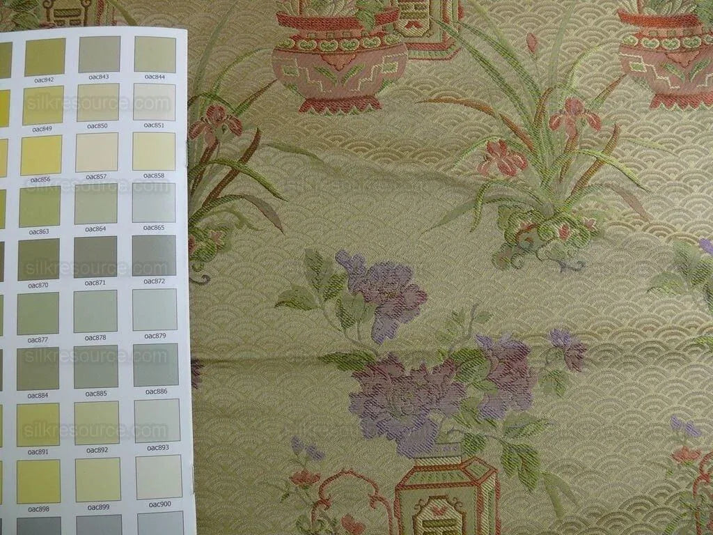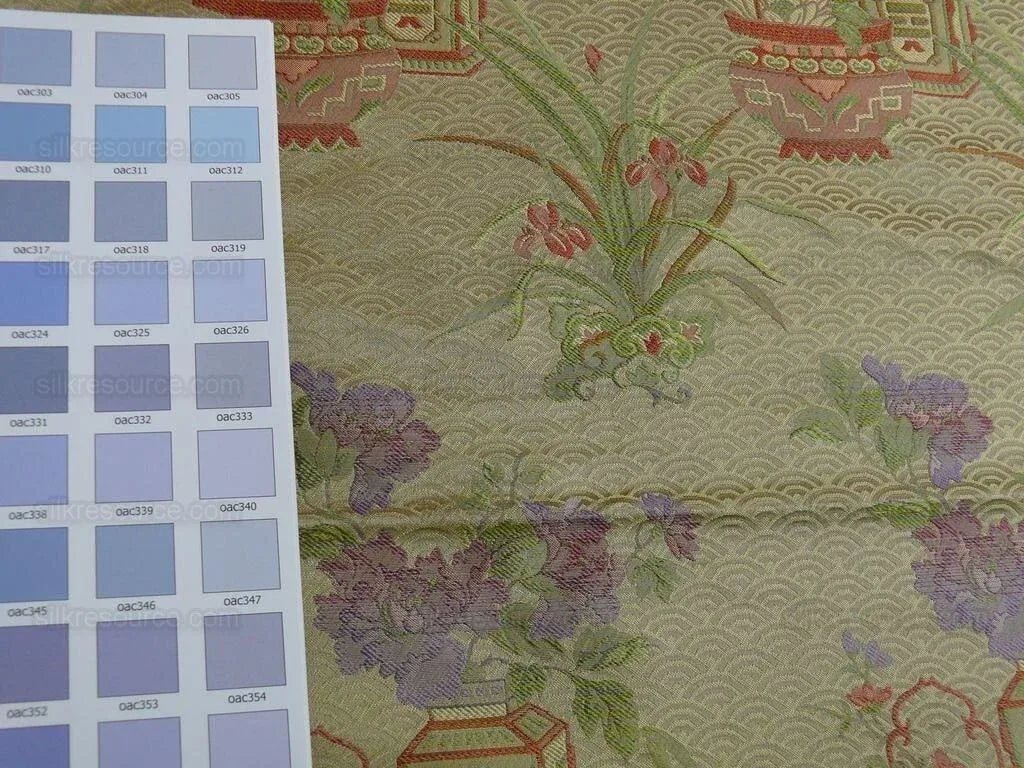 100% silk jarquard. A fainthful reproduction of ancient Chinese brocade. The purple against light chartreuse-gold is simply...devine... Peony=prosperity. Chinese orchid=virtue & solidarity. Lotus=serenity & wisdom Against a "cloud-sea" background.