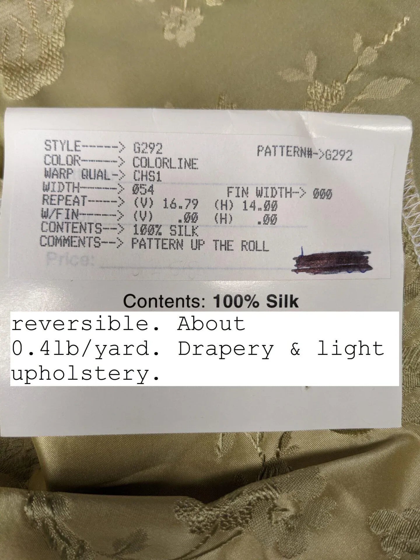 Minimum: 20yards. Delivery time 10-14 weeks after full payment. Sample available for approval. NO return. Please inquire details BEFORE ordering. Just romantic and magical! This silk damask takes inspiration from modern art Neuveu botanical design. Both realistic and fictional. About 0.4lb/yard. Super sheen. Reversible. Application: drapery, light upholstery, garment. Suggested application: drapery, bedding,craft & even garment, light upholstery |