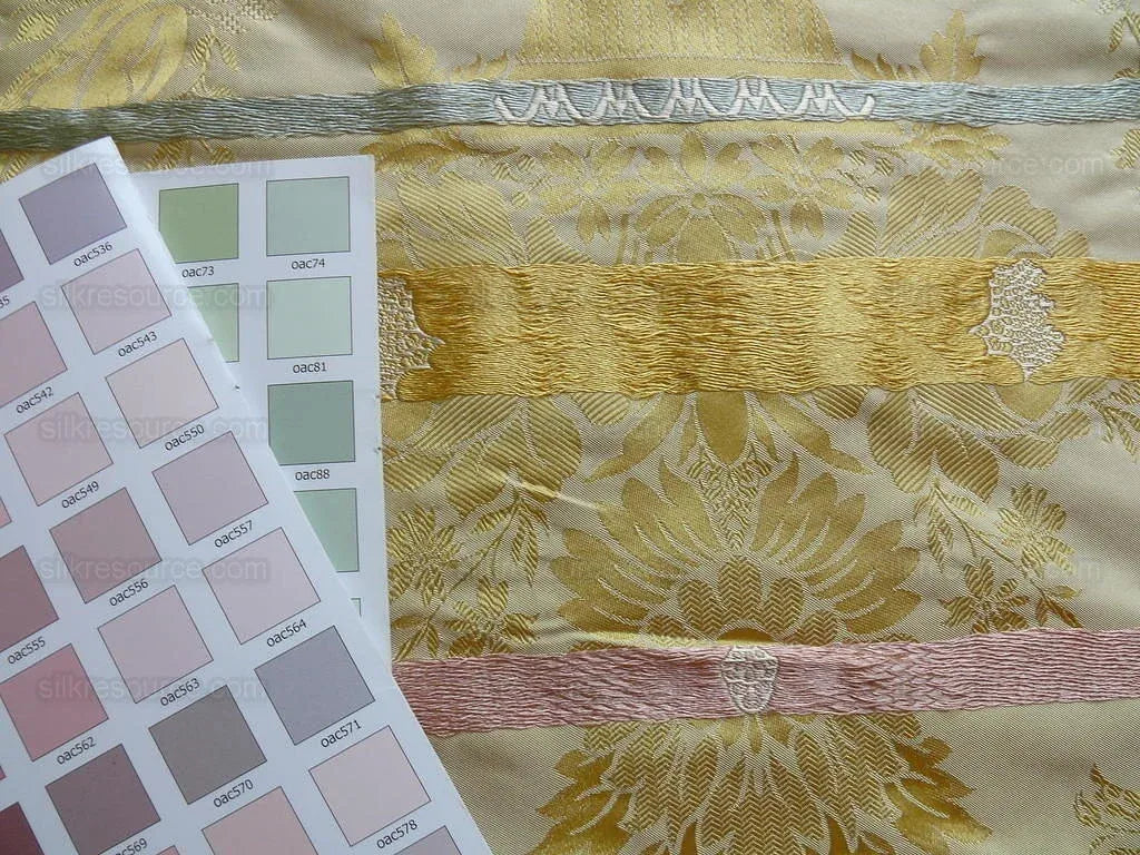 Classic damask of rose urn. 100% silk—luminous! This neoclassic silk depicts rose bouquets, acanthus, grapes and berries in a Greek urn. Please notice the highlights in colors of bright blue, pink. yellow gold over the muted pale green background. This small detail is achieved by putting colored yarns behind the fabric most of the time and only comes out on the “face” side rhythmically. This technique is called “tissue pick”.