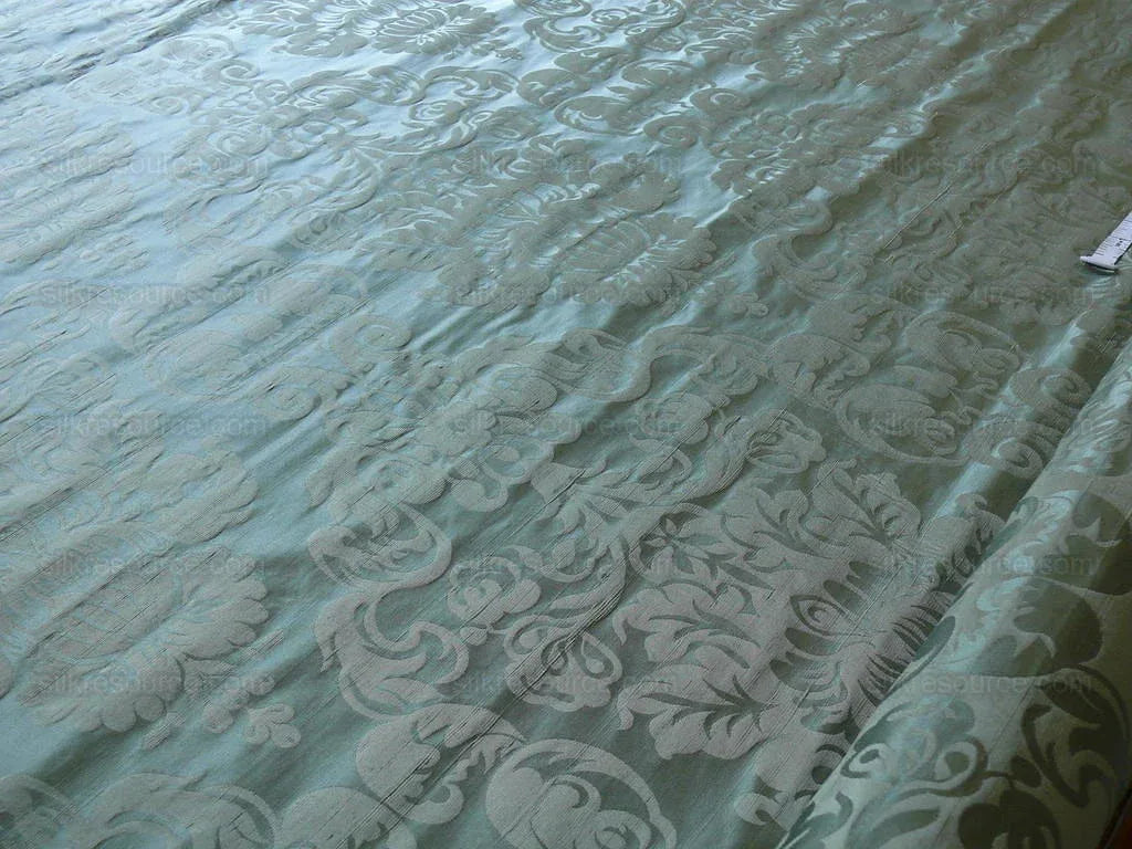 By Yard High End 100% Silk Damask Raw Texture Floral "bijou Blue" Green Blue