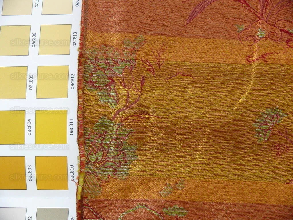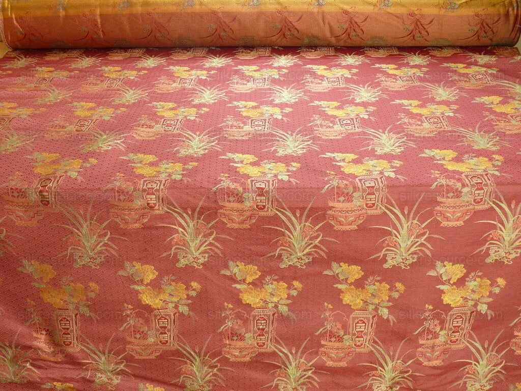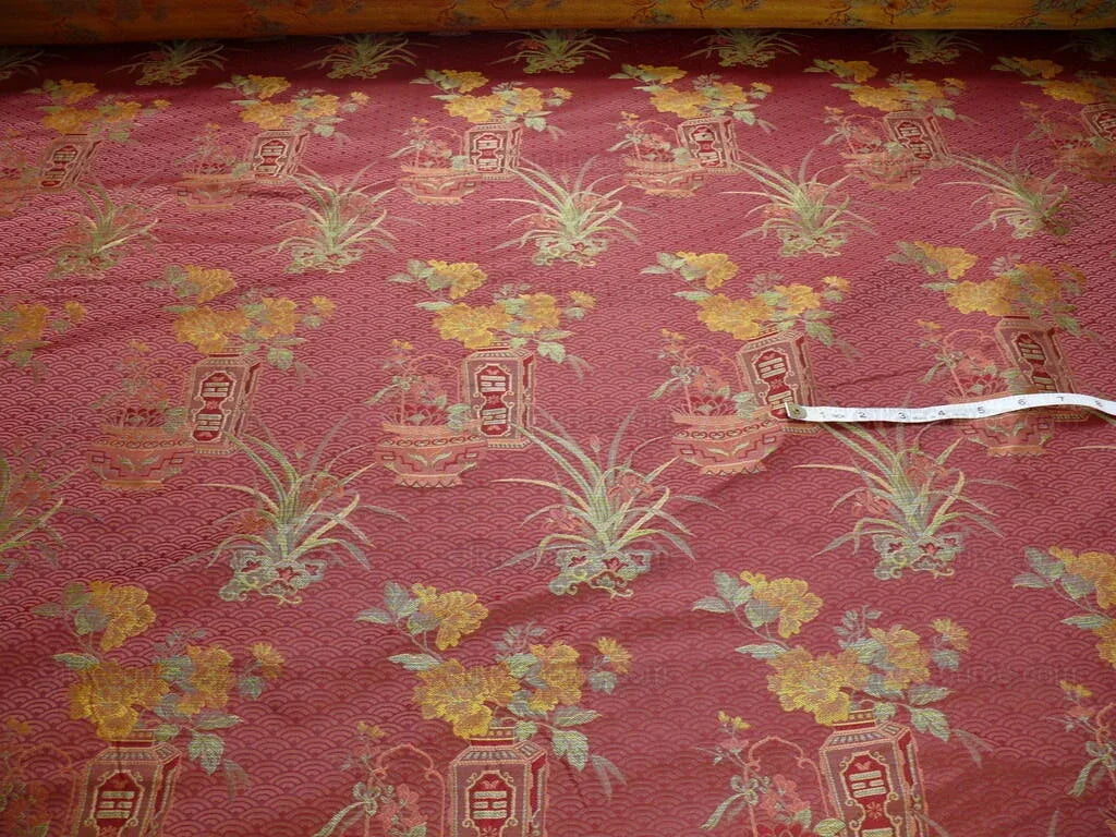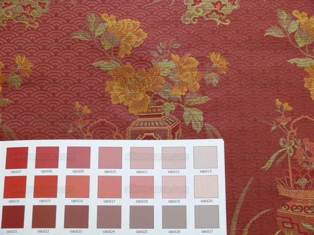 by yard 100%silk Lampas Chinoisery Gold Peony Basket Vase Mulberry Red