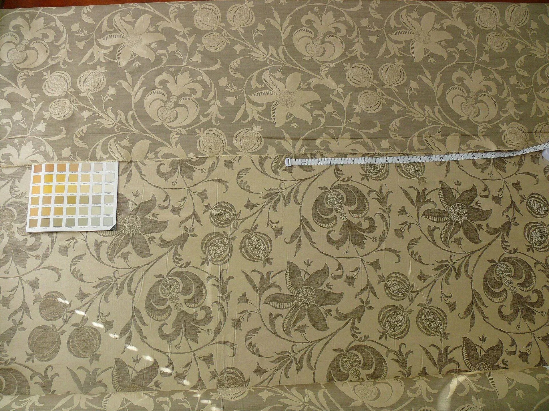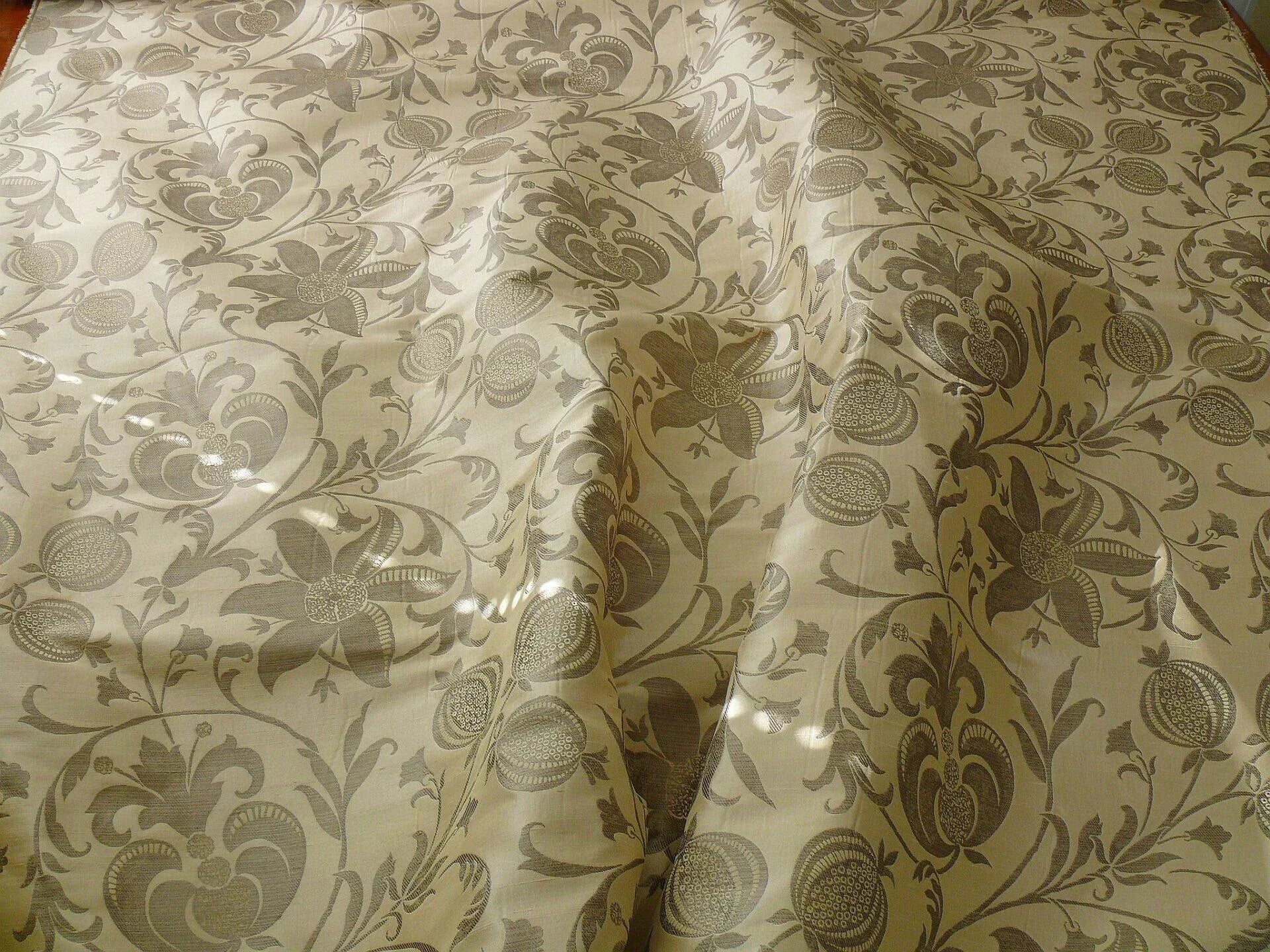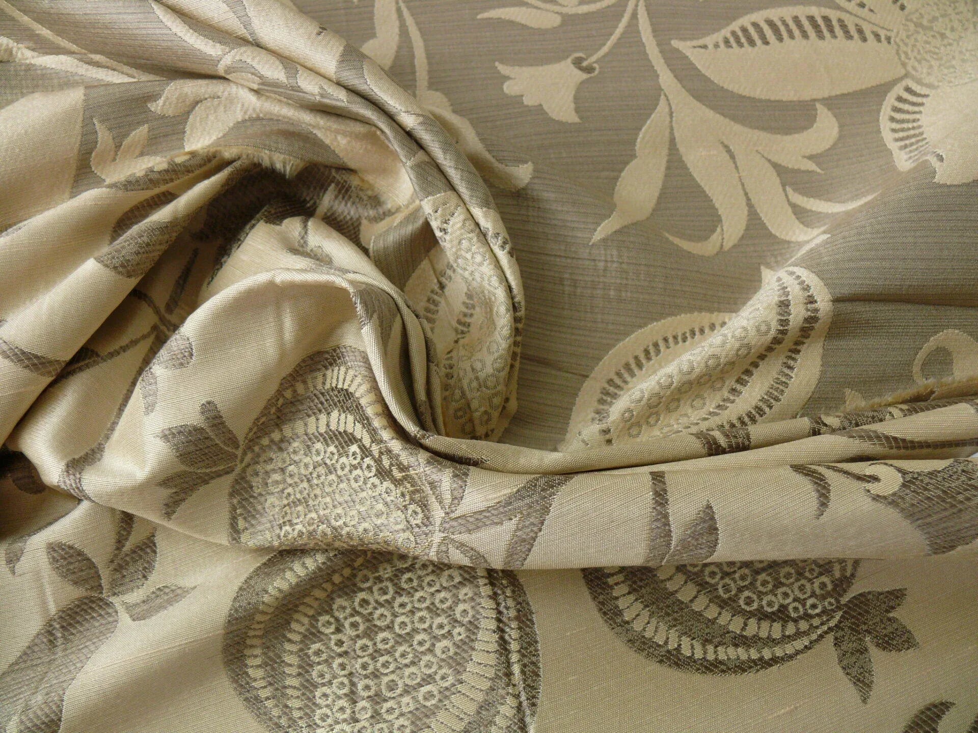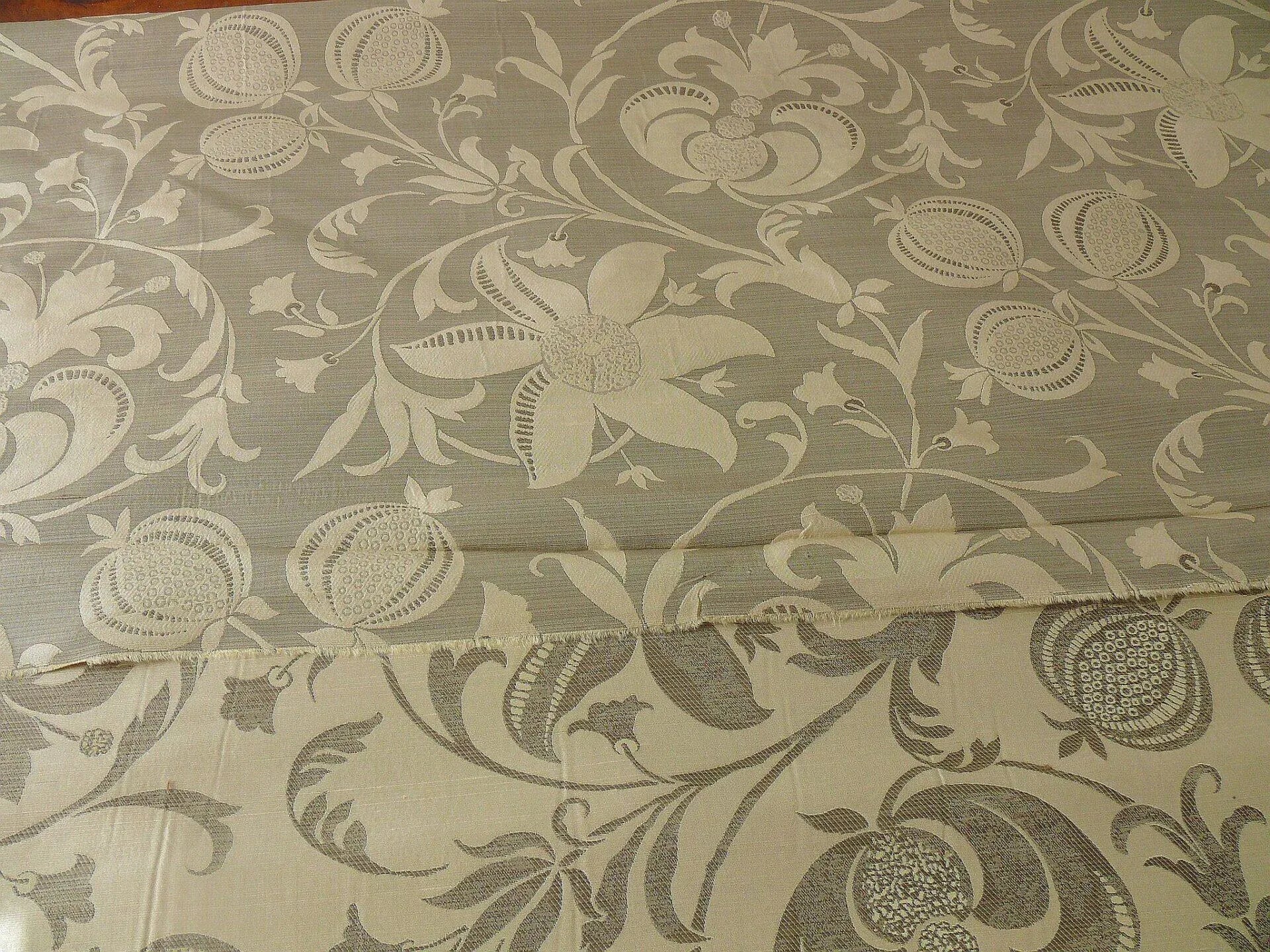 Good weight and leathery texture. 100% silk. Reversible! The mythical fairyland tree and flowers have so many details and such a playful spirit. Very much like what Josef Frank will do! Heavy weight for silk: about 0.5lb/yard. Suggested use: drapery, upholstery, bedding, garment. Fabric color: "silver", silver, grey, beige . Reversible Last few photos are client's project in same fabric of ANOTHER colorway. |
