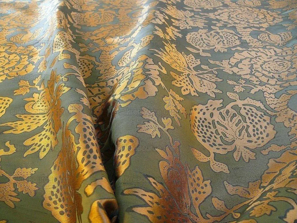 by yard 100% Silk Lampas Papercut Tree Of Life Pom "bijou Blue"