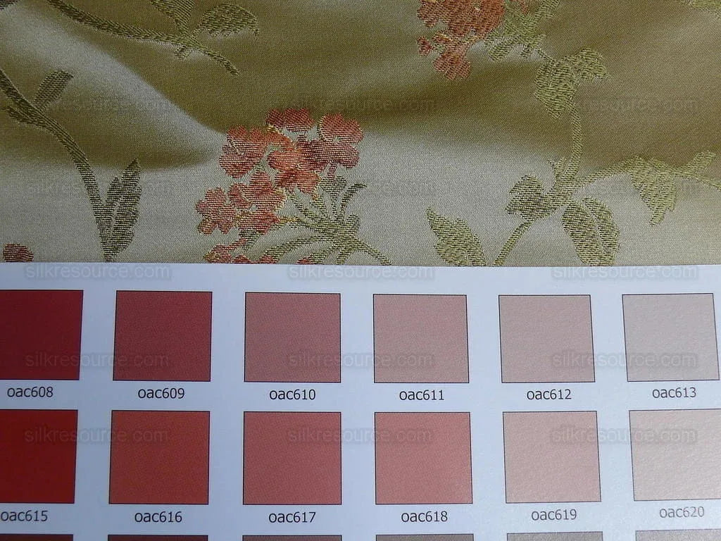 100% silk lampas. Rich & layered sage blossoms woven onto a satin background.
