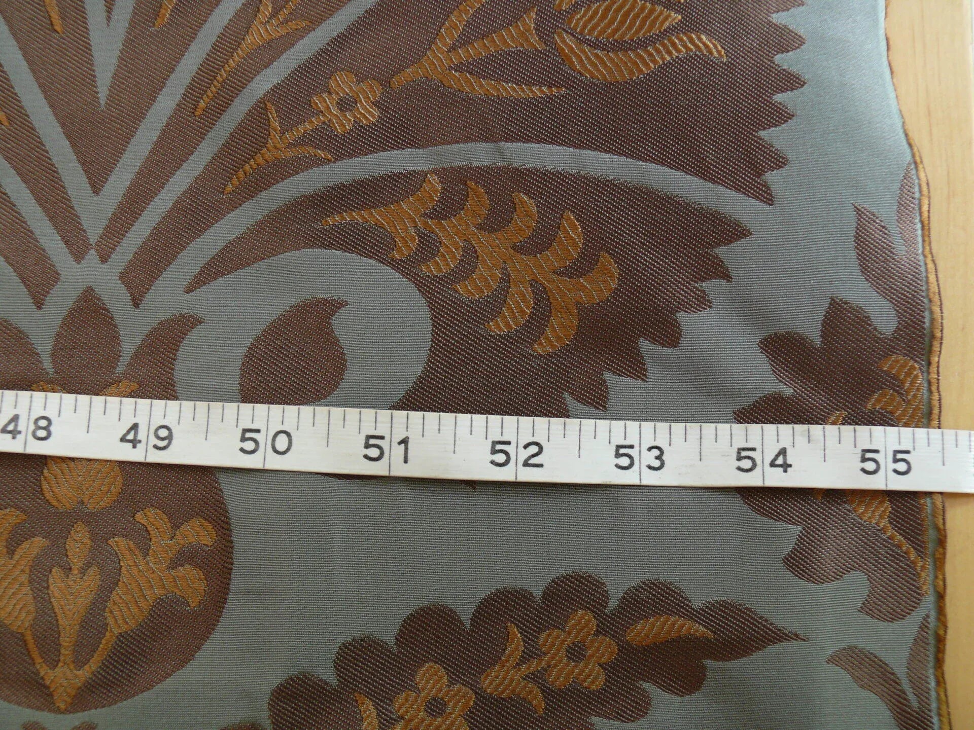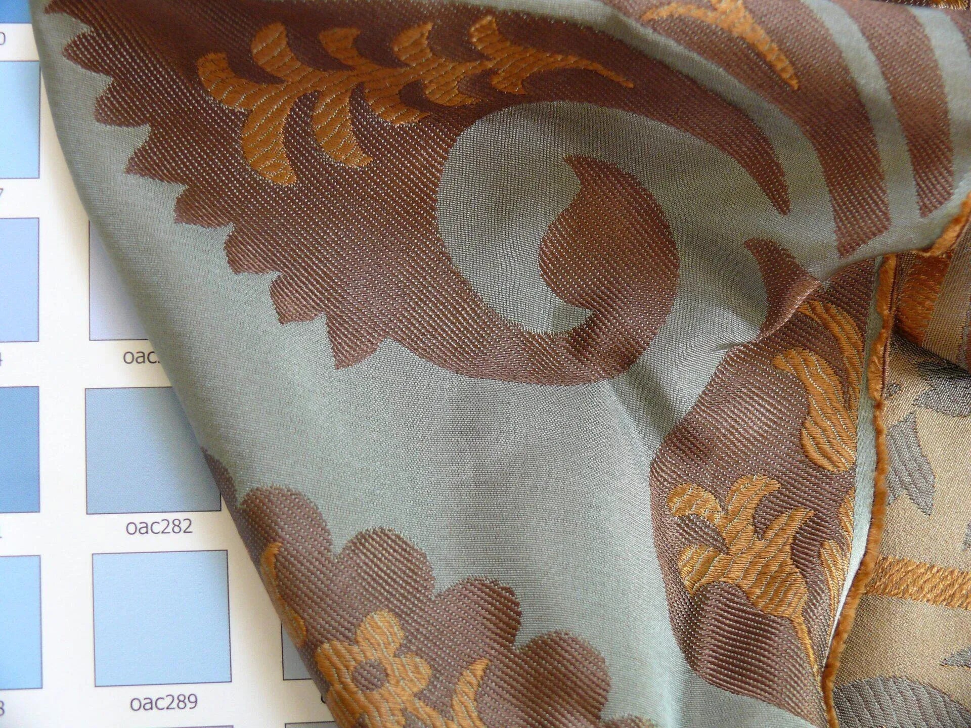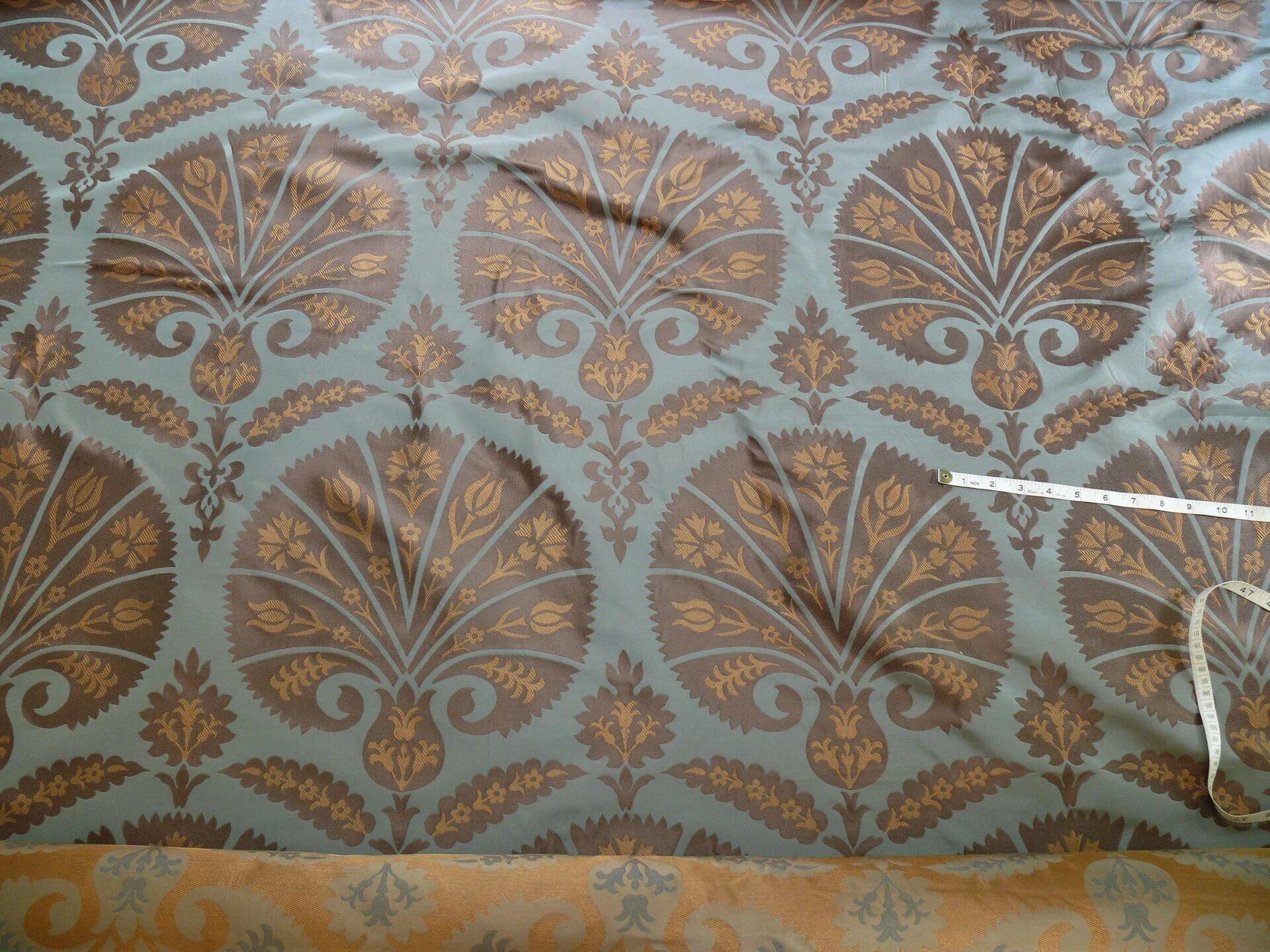 100%silk Lampas Tulip Fan Damask 536 "branch" Teal Blue Brown Gold Bty MSRP USD296/y!