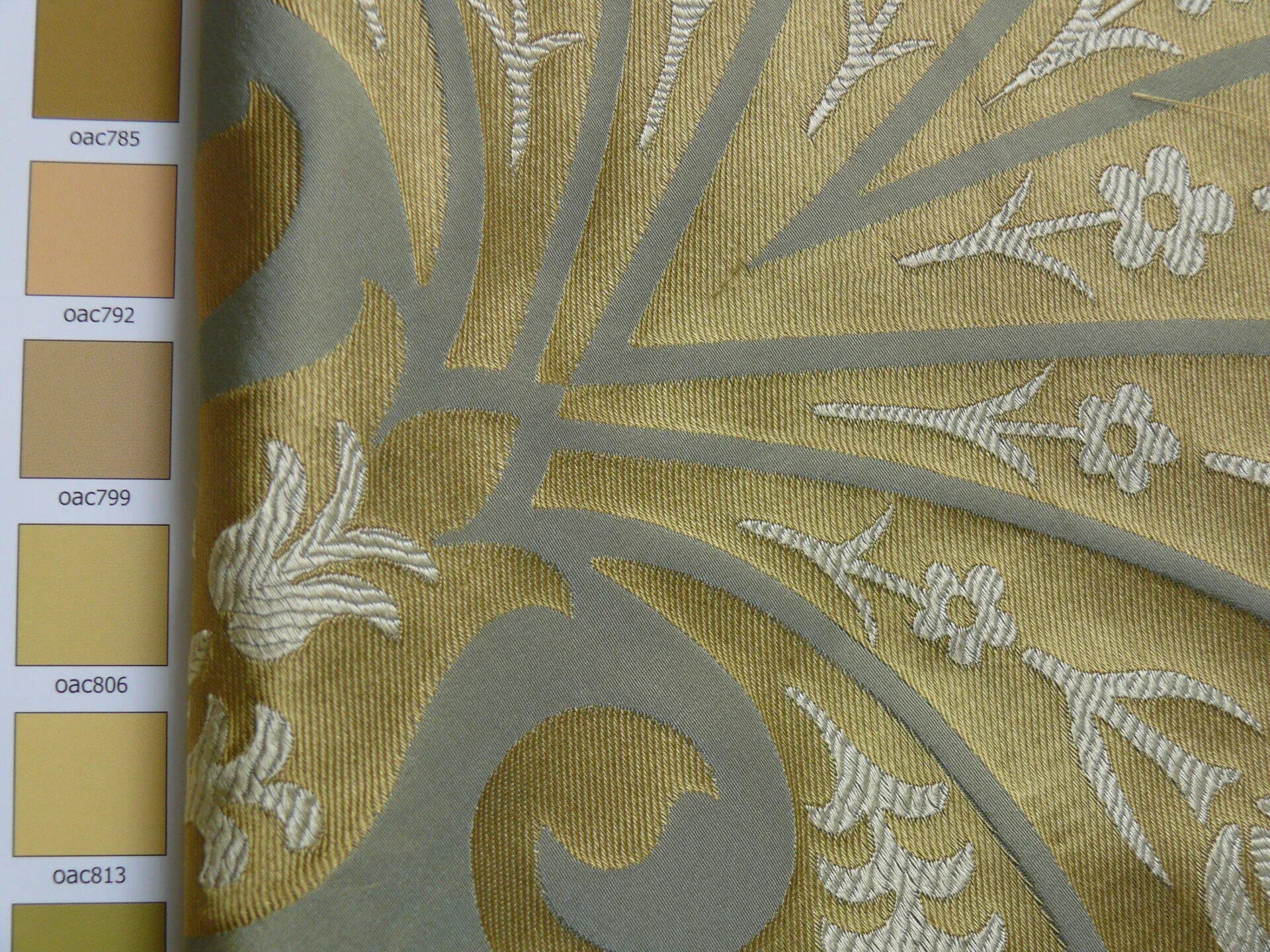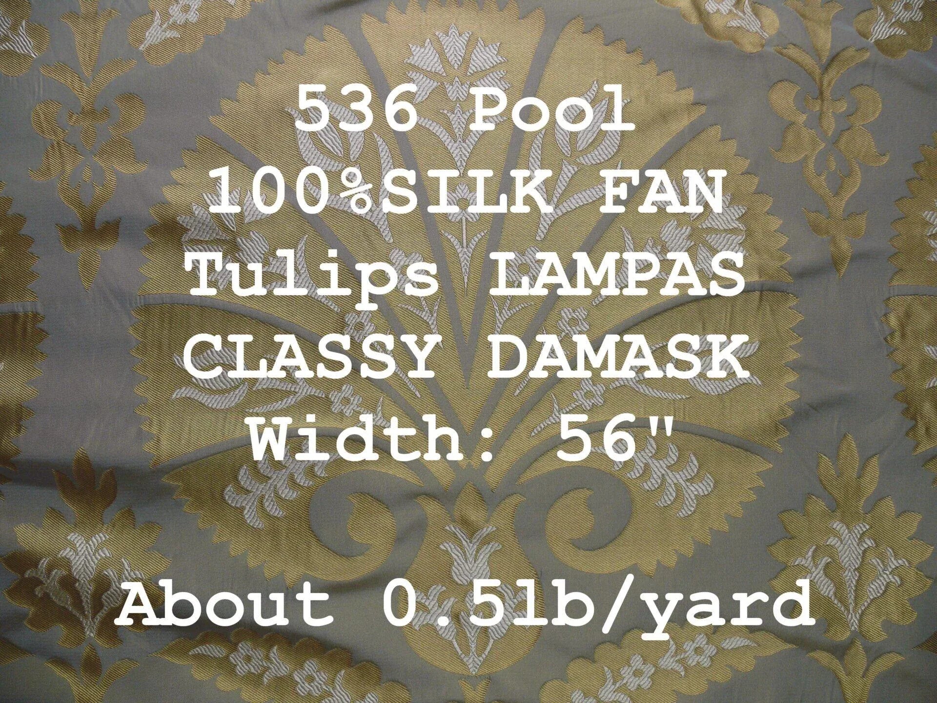 by yard 100%silk Lampas Tulip Fan Damask 536 "pool" Aqua Blue Cream Gold Bty MSRP USD296/y!