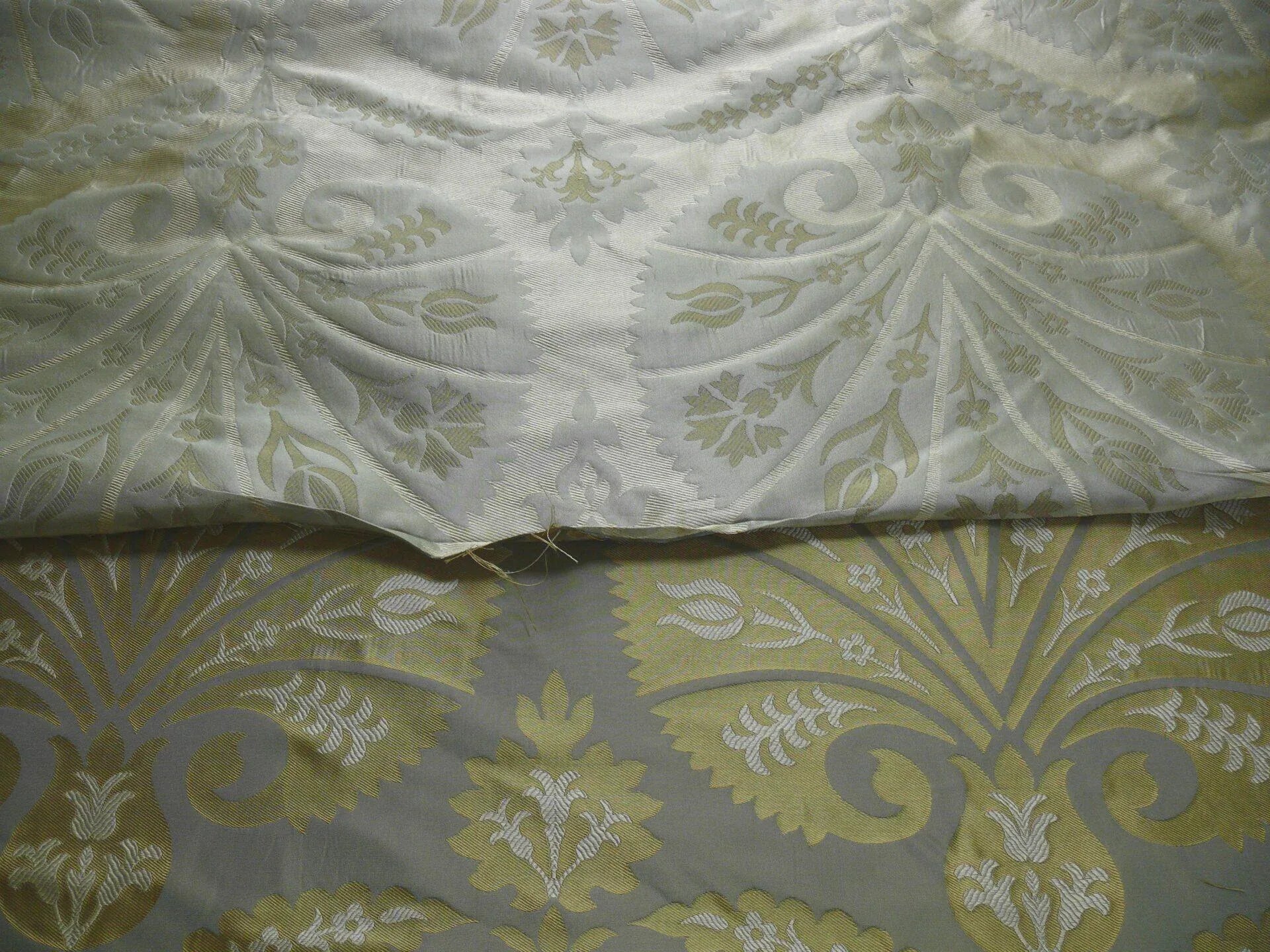 Classy damask design.Fan or seashell? With Tulip, lily, rose & fern on each pedal...Made for high end designer house. Similar silk lampas now goes for about $300/yard.