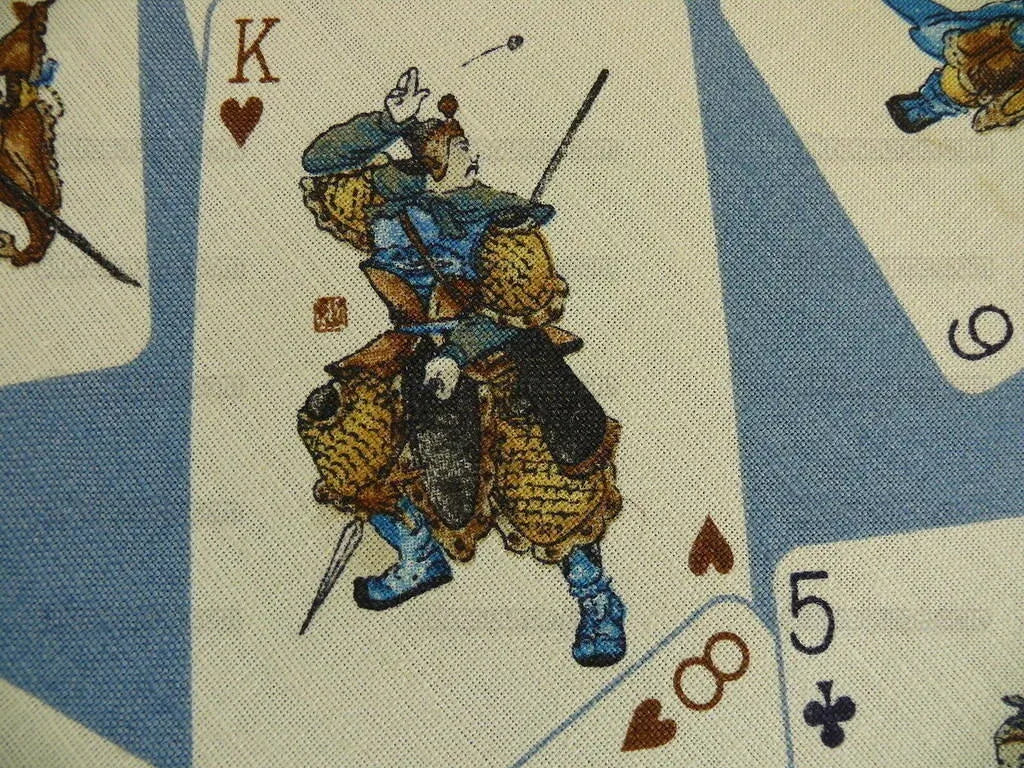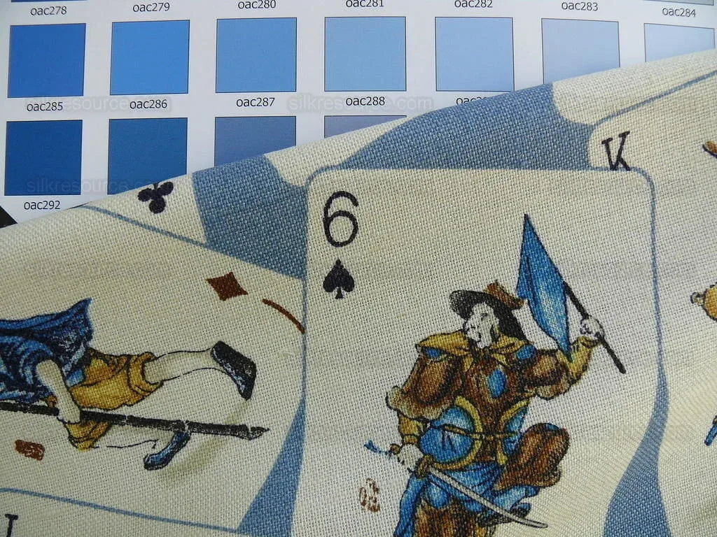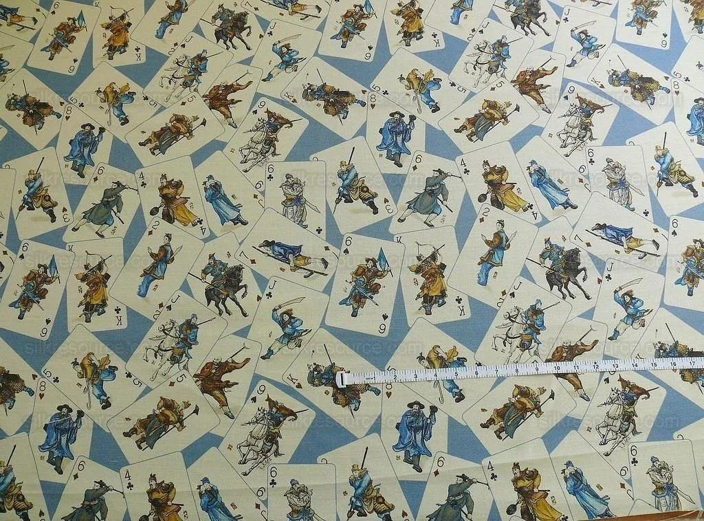 Color: Background is sky blue.Cards in cream a very pale butter yellow)Various brown, gold, black. Please See Color Chart. MSRP: about $200/yard.10yds total.Priced way below wholesale. Weight:medium-heavy weight linen. About 1lb per yard.Very good weight linen---upholstery rated. |