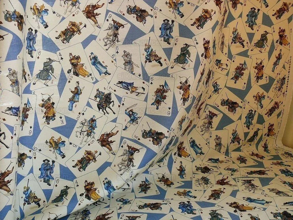 To Dr. H. Zan We shall be together again , just like the 108 stars line up once more. Extremely well executed Chinosere figures from ancient Chinese novel Shui Hu---about 108 Robbinhood-like bandits. Beautiful & immaculate. For lovers of 1)linen, 2)Chinosere, 3)literature, 4)folk-lore, 5)exotic other-land, 6)history, 7)martial art &, at last, 8)cards. Designer: Elizabeth Benefield (through Travers) "They are manufactured in England on the best quality linen, linen blends, cotton and silk. " 34% Cotton 66% Linen Total width 54" HR 18", VR 16 "