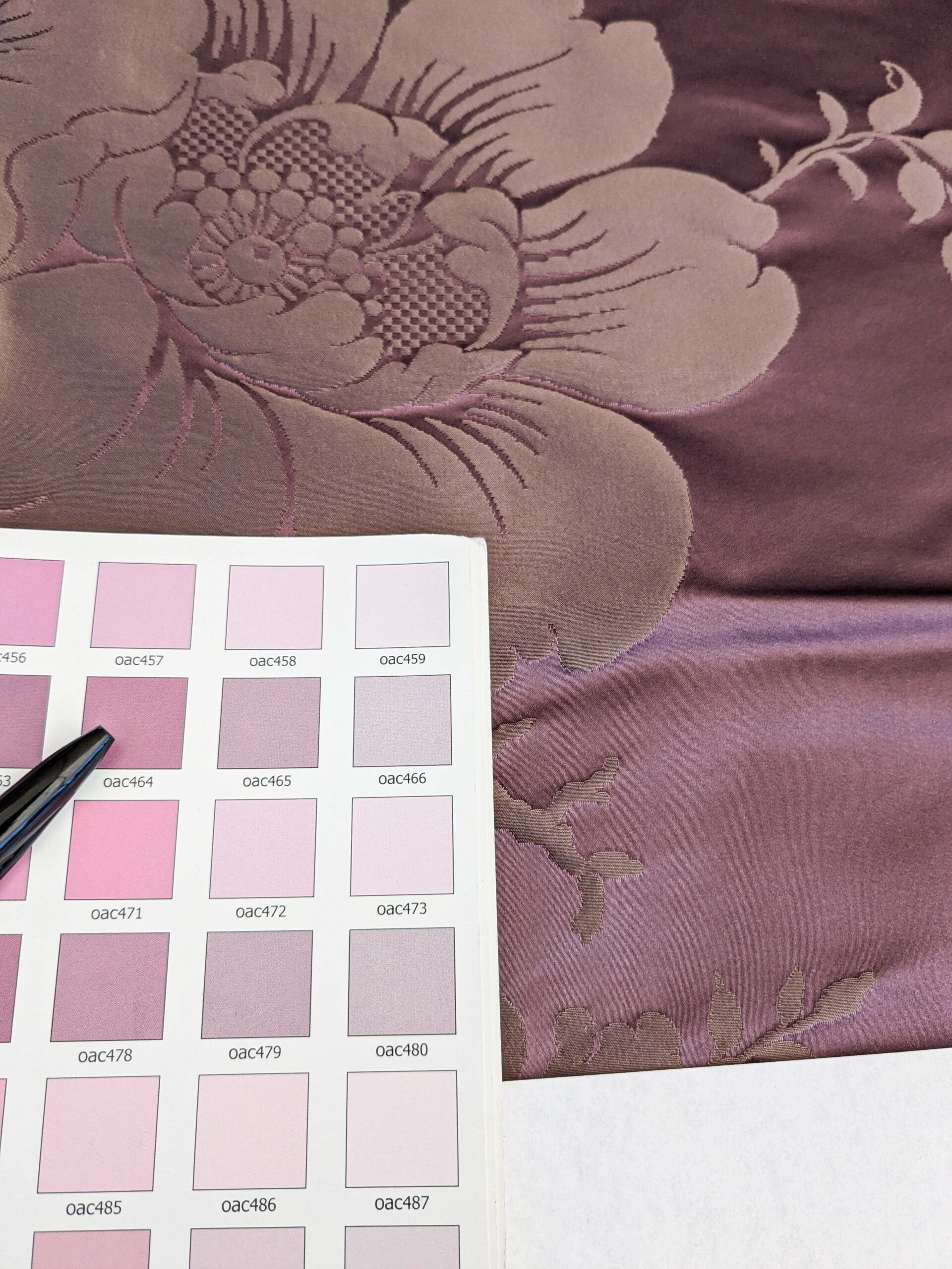 This is a large damask in the Louis XV style depicting a tree of life of Eastern inspiration. The refined motif of flowers with delicately curled petals and foliage gracefully attached to a climbing branch shows how the elegance of the court influenced the decorative arts of this period. The beauty of the colors explodes in strong tones of ruby, gold, amethyst, bronze and more subtle shades of nattier, puce... with an almost metallic reflective quality.