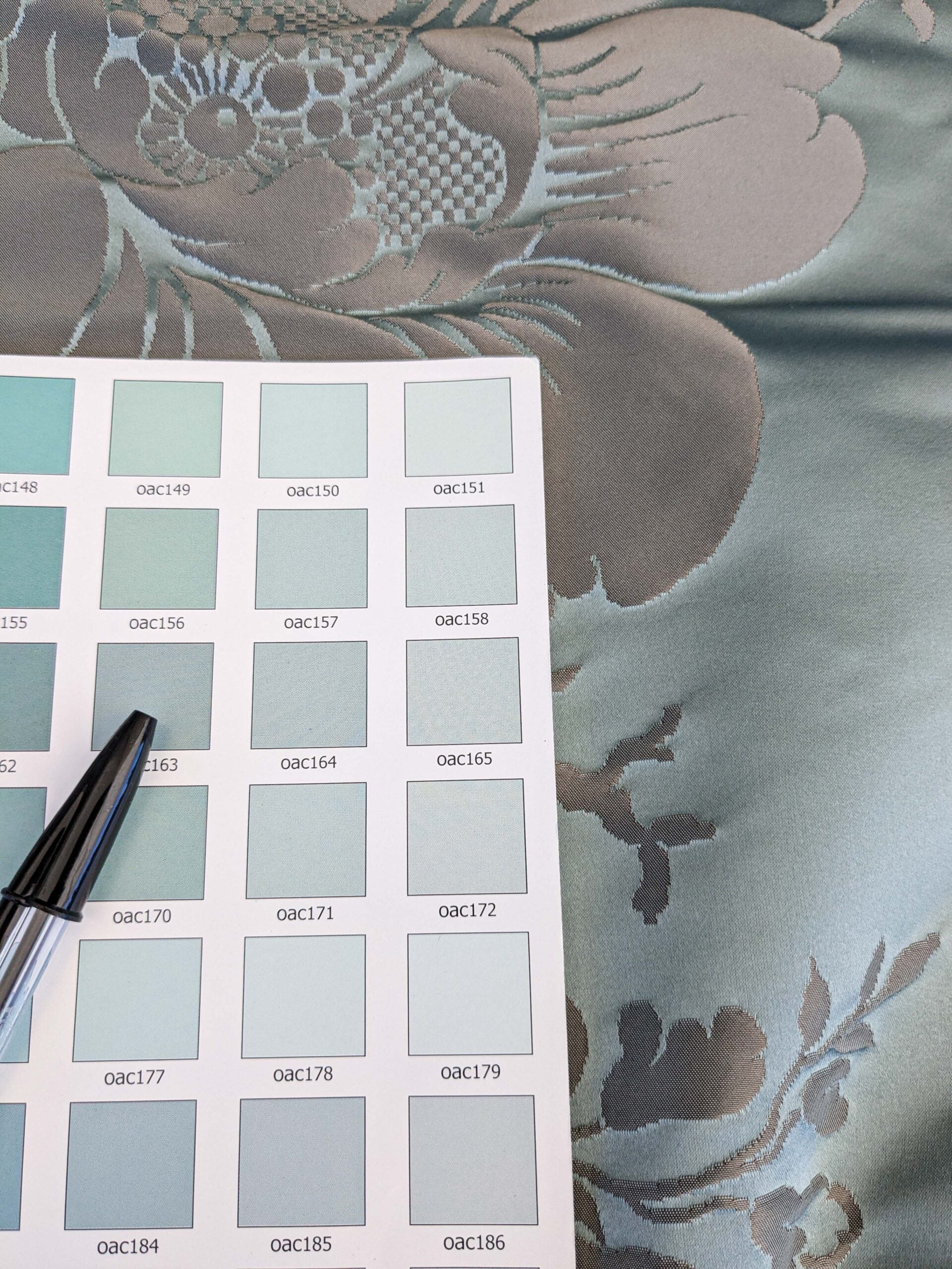 This is a large damask in the Louis XV style depicting a tree of life of Eastern inspiration. The refined motif of flowers with delicately curled petals and foliage gracefully attached to a climbing branch shows how the elegance of the court influenced the decorative arts of this period. The beauty of the colors explodes in strong tones of ruby, gold, amethyst, bronze and more subtle shades of nattier, puce... with an almost metallic reflective quality.