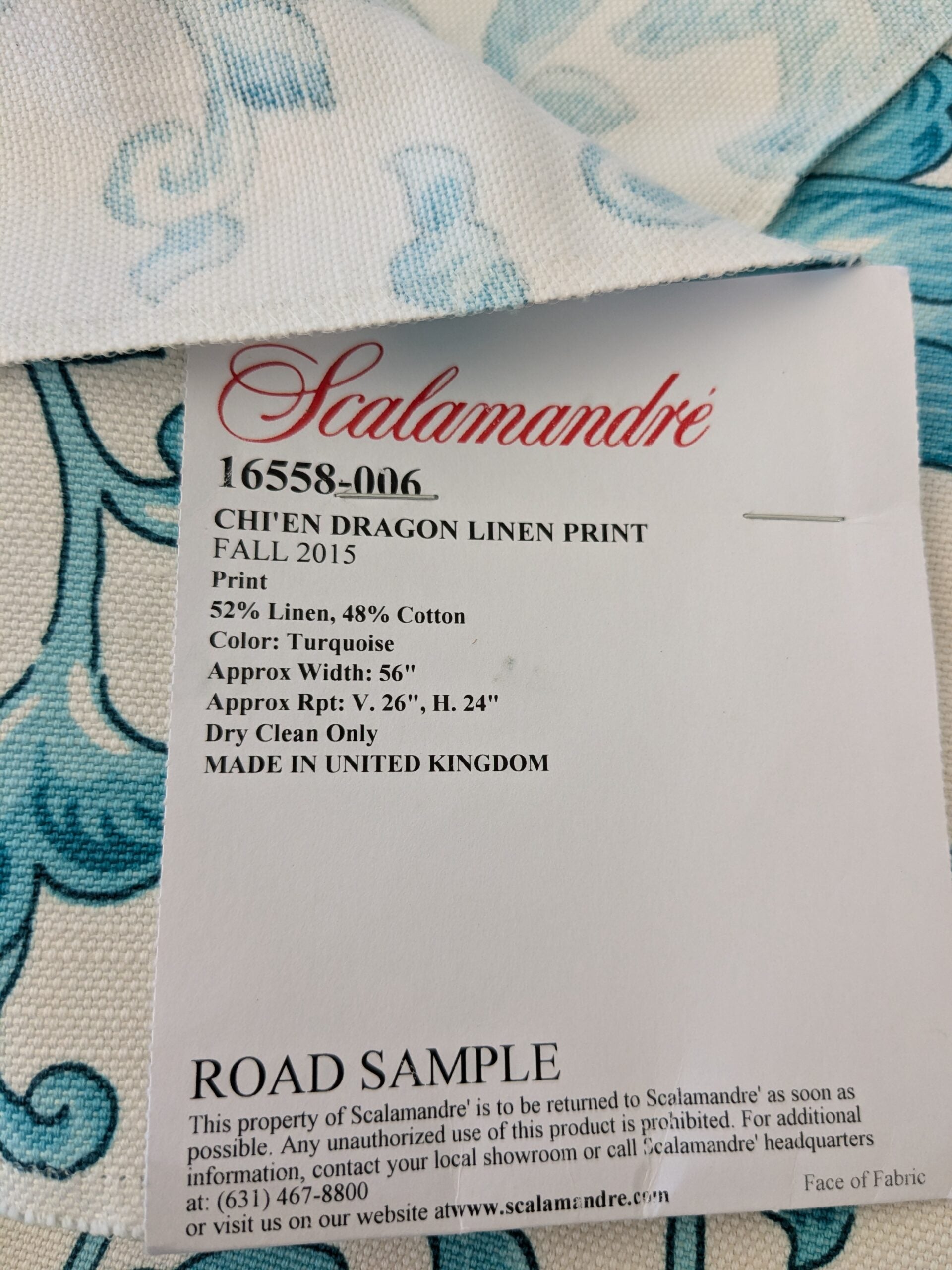 129 EV47 Square Scalamandre Chi’en Dragon Linen Print Turquoise Blue White 26"x26"