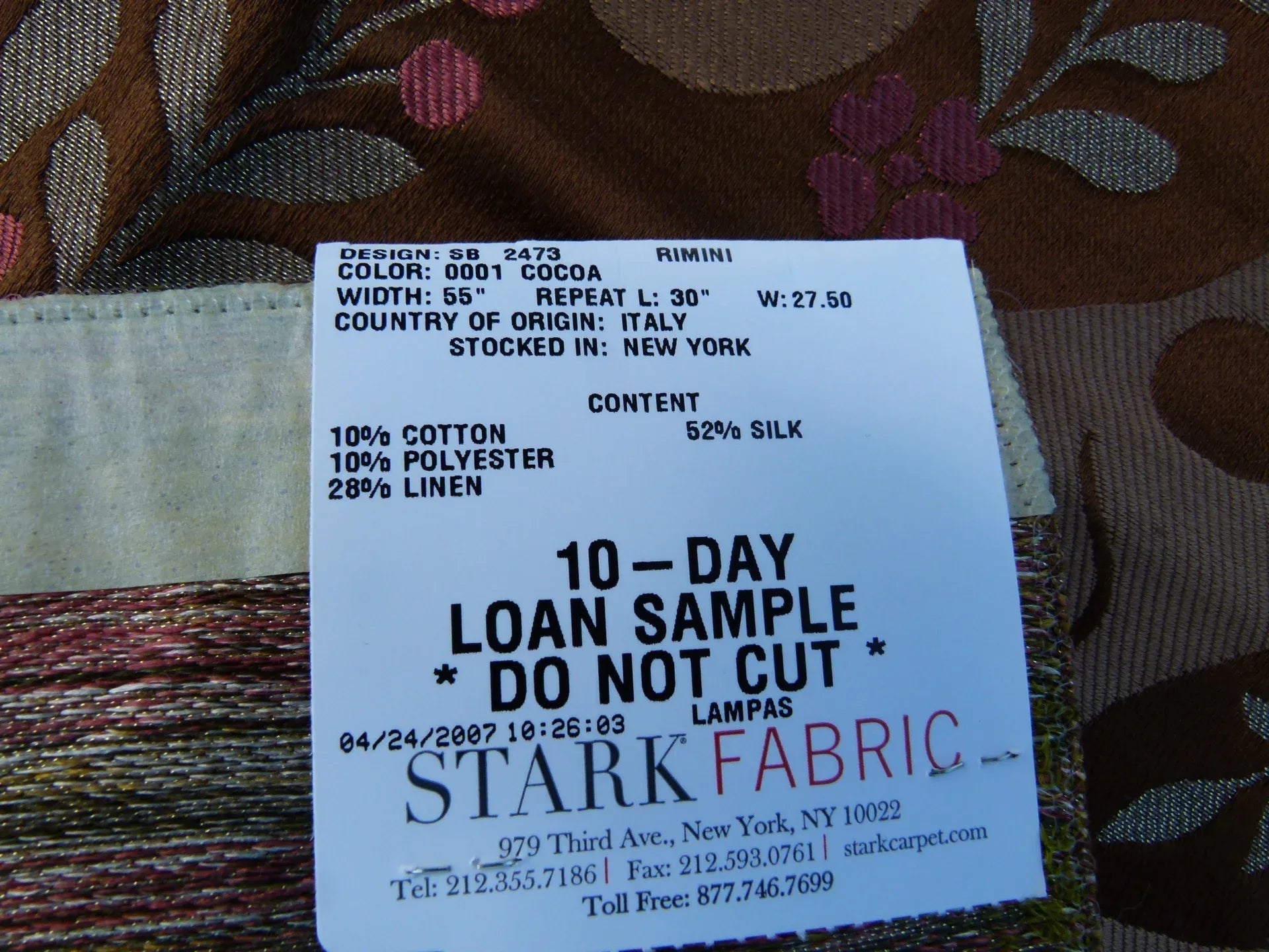 Fiber, repeat, width, weight, country of origin, WHOLESALE price/yard:
