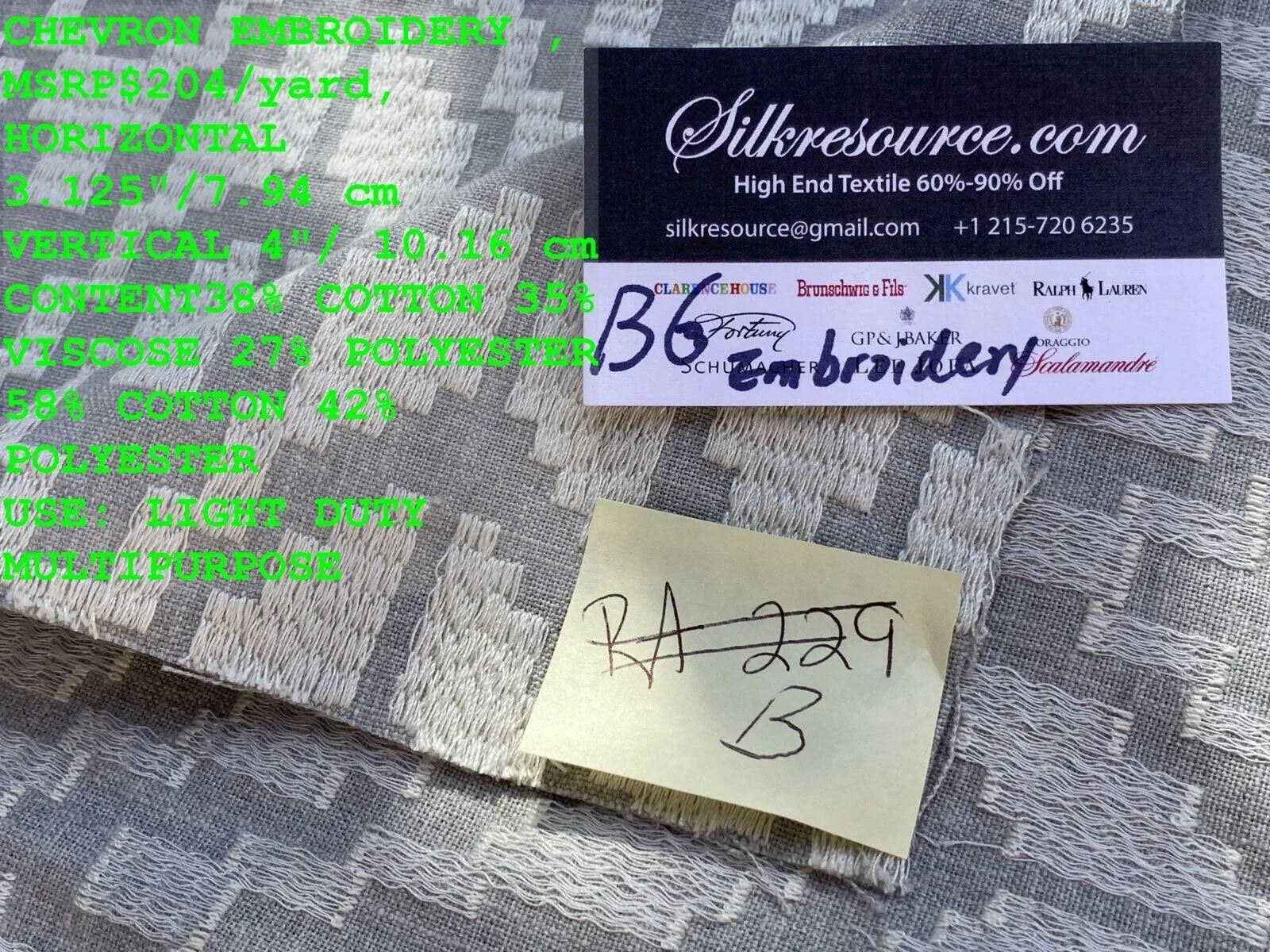 Fiber, repeat, width, weight, country of origin, WHOLESALE price/yard:
