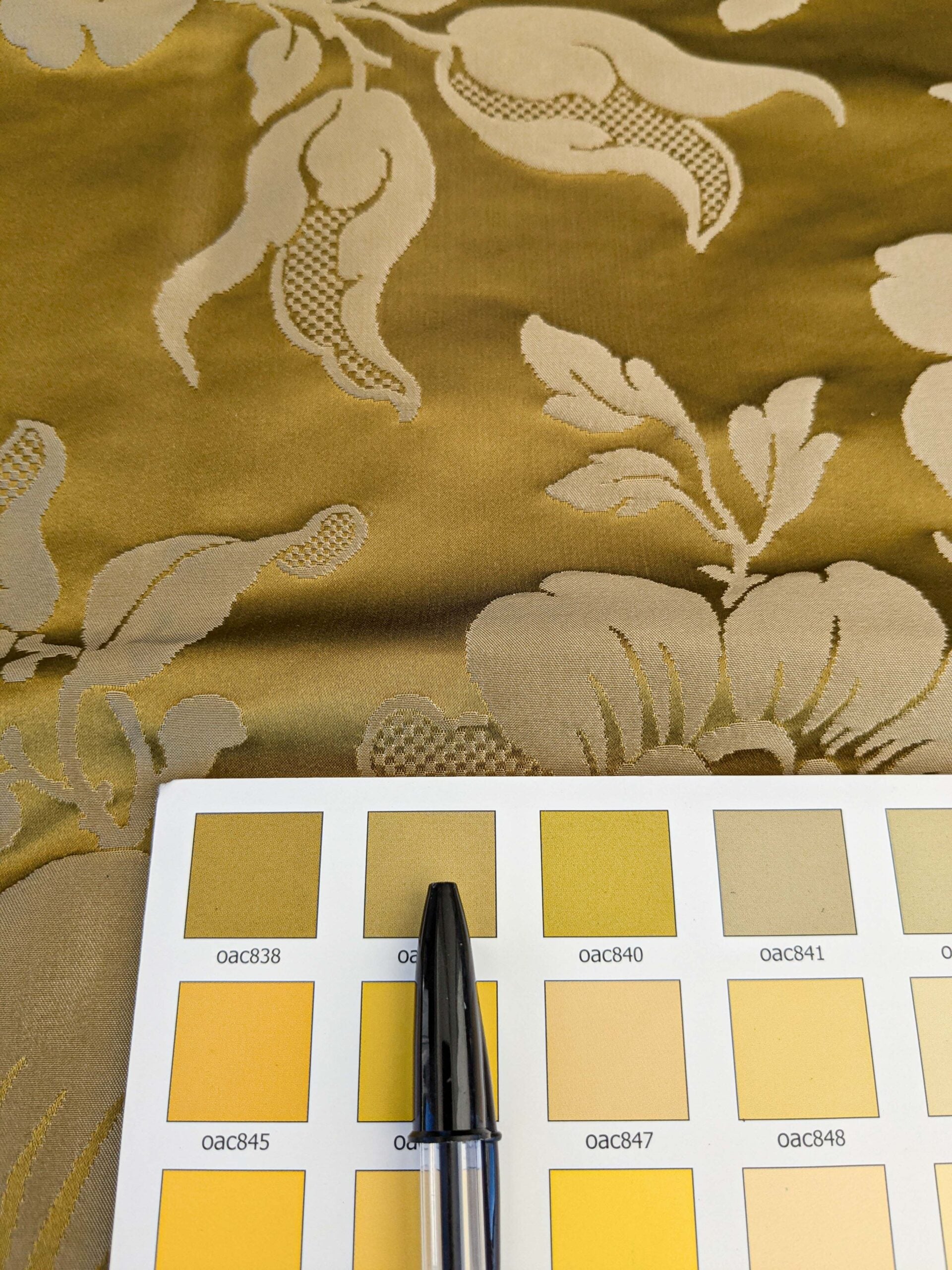 This is a large damask in the Louis XV style depicting a tree of life of Eastern inspiration. The refined motif of flowers with delicately curled petals and foliage gracefully attached to a climbing branch shows how the elegance of the court influenced the decorative arts of this period. The beauty of the colors explodes in strong tones of ruby, gold, amethyst, bronze and more subtle shades of nattier, puce... with an almost metallic reflective quality.