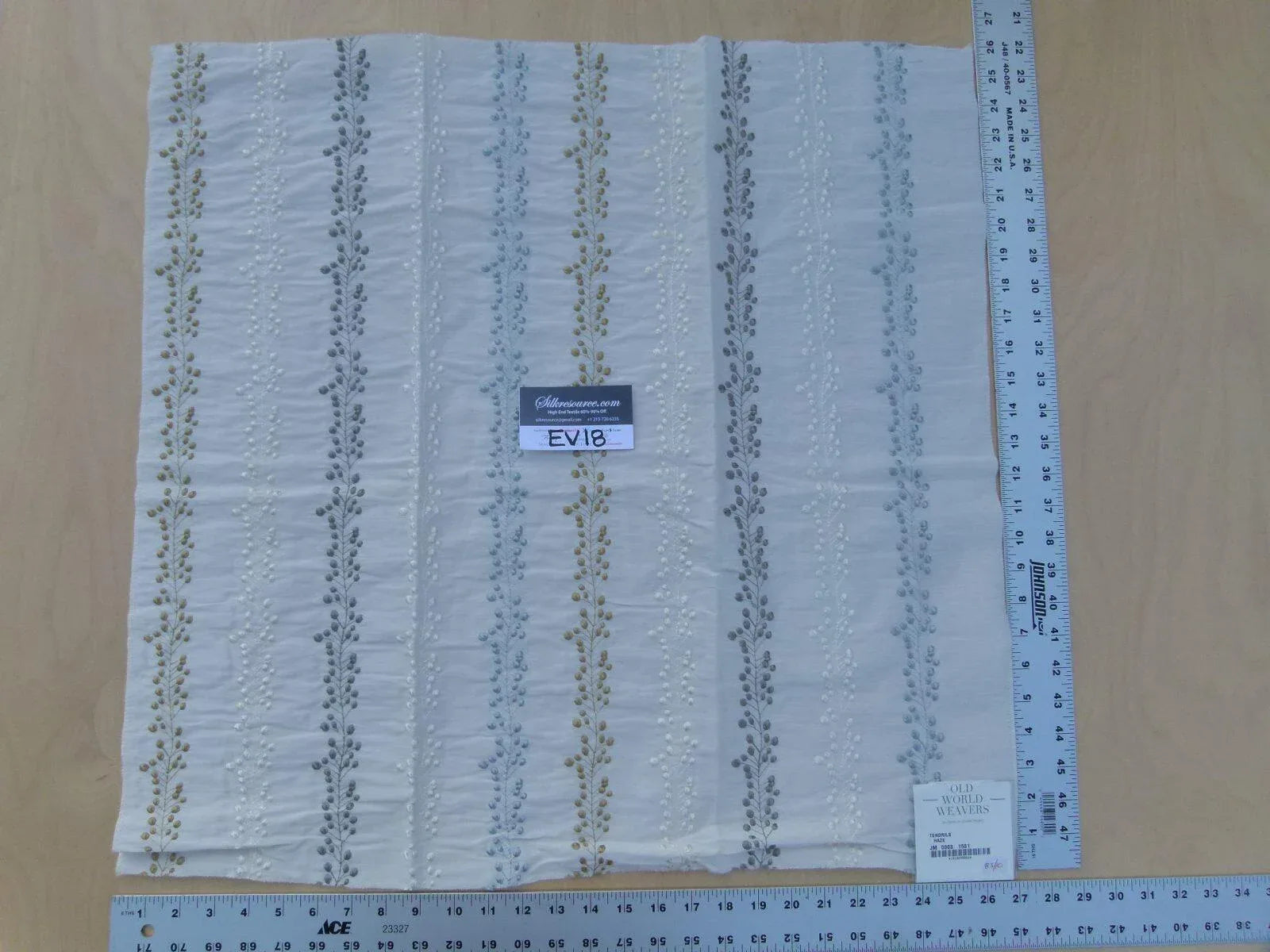 15 Ev18 Scalamandre 26"x26" Tendrils Haze Ivory Tan Blue Linen Embroidered Leaf Dot Stripe