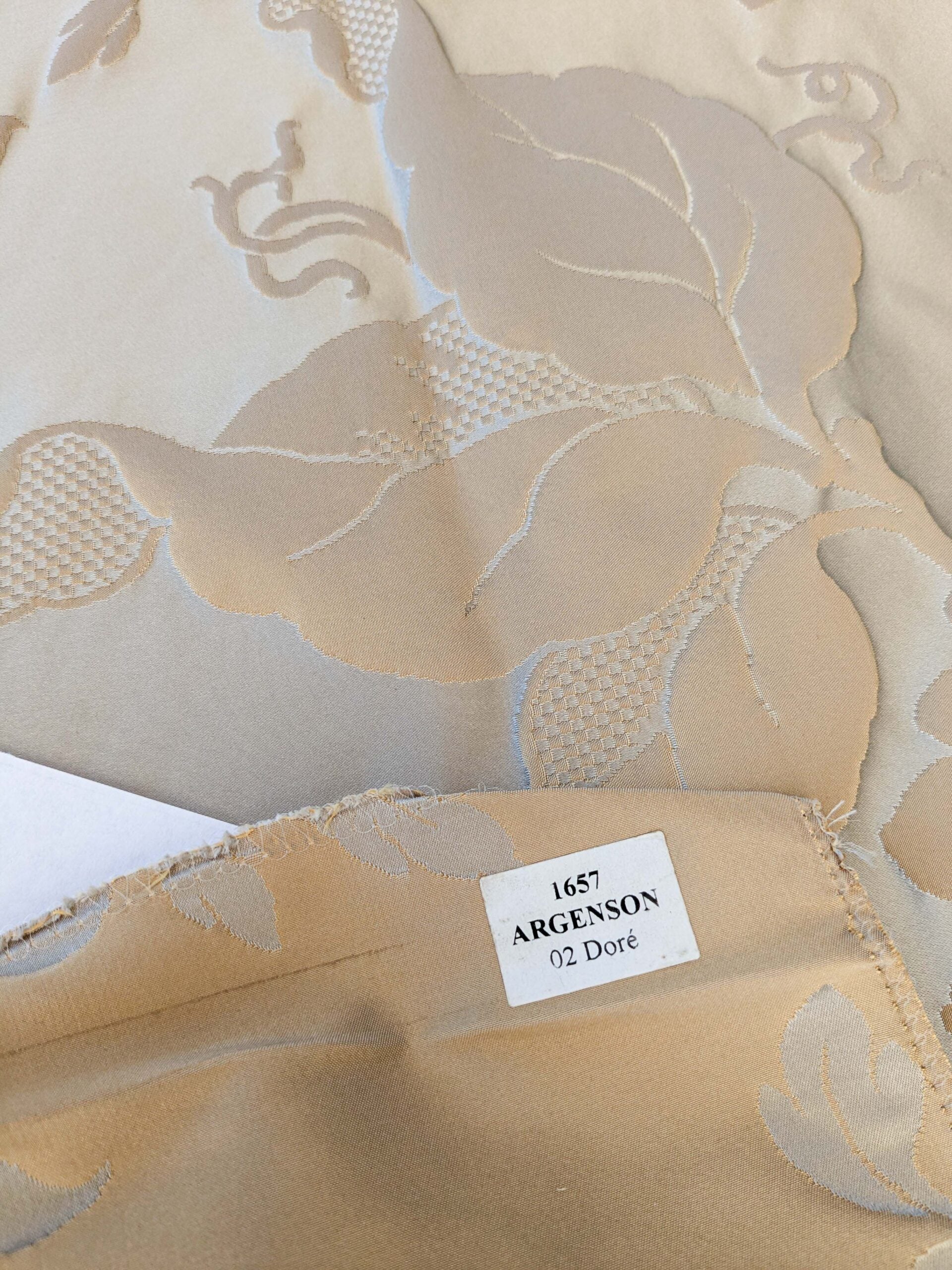This is a large damask in the Louis XV style depicting a tree of life of Eastern inspiration. The refined motif of flowers with delicately curled petals and foliage gracefully attached to a climbing branch shows how the elegance of the court influenced the decorative arts of this period. The beauty of the colors explodes in strong tones of ruby, gold, amethyst, bronze and more subtle shades of nattier, puce... with an almost metallic reflective quality.