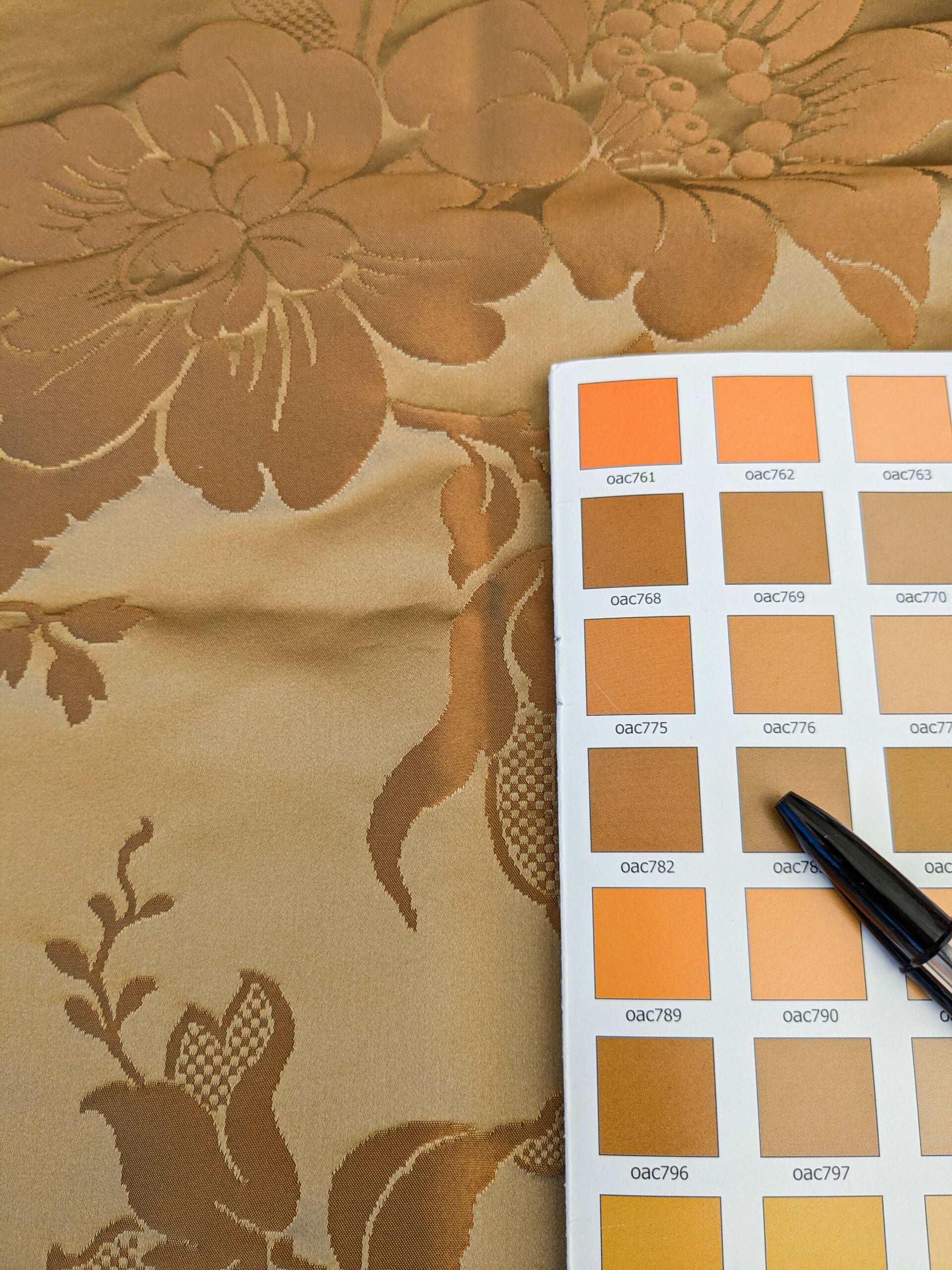 This is a large damask in the Louis XV style depicting a tree of life of Eastern inspiration. The refined motif of flowers with delicately curled petals and foliage gracefully attached to a climbing branch shows how the elegance of the court influenced the decorative arts of this period. The beauty of the colors explodes in strong tones of ruby, gold, amethyst, bronze and more subtle shades of nattier, puce... with an almost metallic reflective quality.