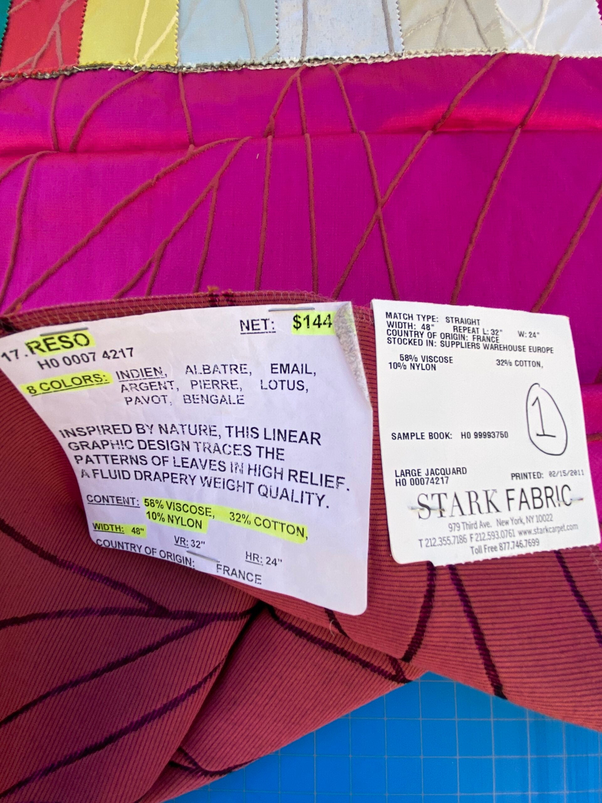 Fiber, repeat, width, weight, country of origin, WHOLESALE price/yard: