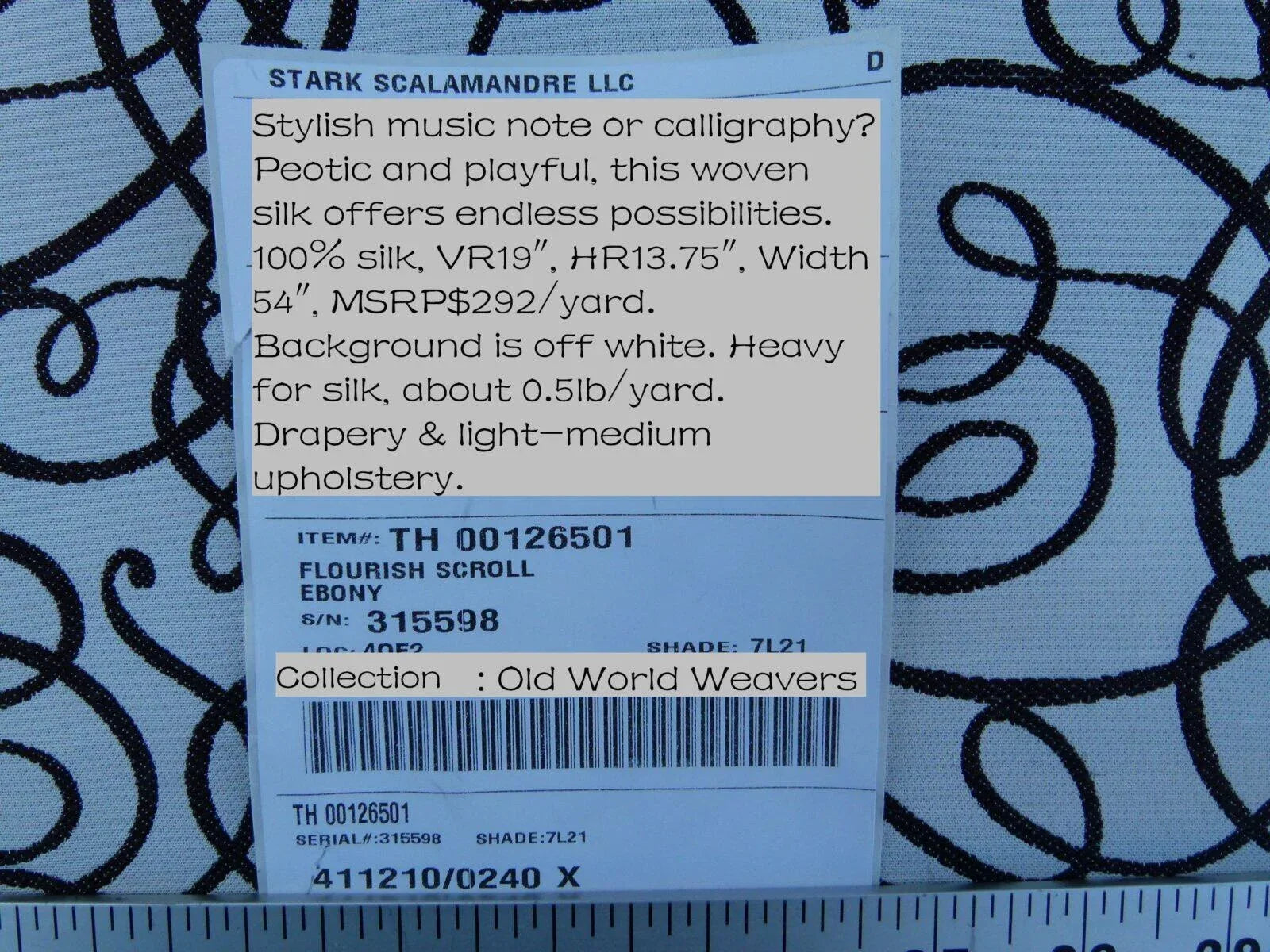Flourish Scroll is a melodic silk lampas. Layers of silk fiber piled together to create this thick and rich jacquard. The scroll confidently plays with different thickness and directions. It's both classic and modern, both simple and sophisticated. Somewhat reversible. The reverse side can be used for drapery but not upholstery. Content: 100% Silk. Color: Black & White Background is off-white. Weight: medium heavy. About 0.51b per yard. Heavy for 100% silk. Application: Drapery, light and medium upholstery, garment Width:54", Repeat Width: L: 19", W: 13.75" Collection: Old World Weavers
