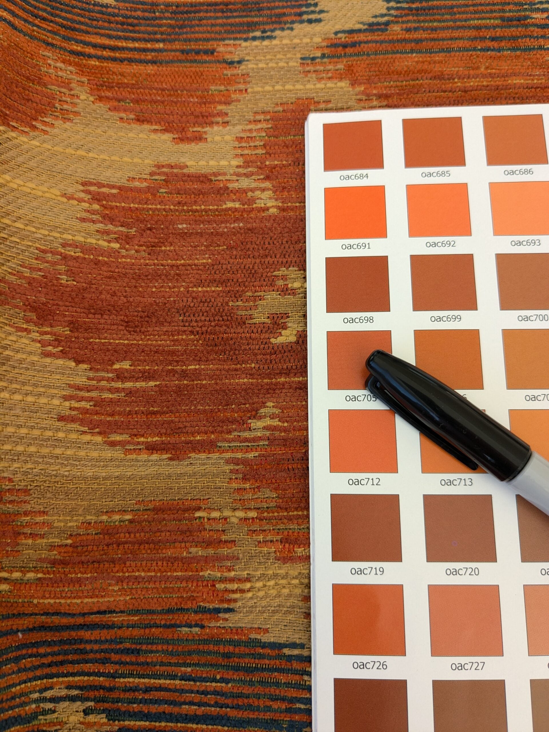 The palette is an unusual combination of earthy red orange against deeper blue-purple, on a neutral beige/tan background.