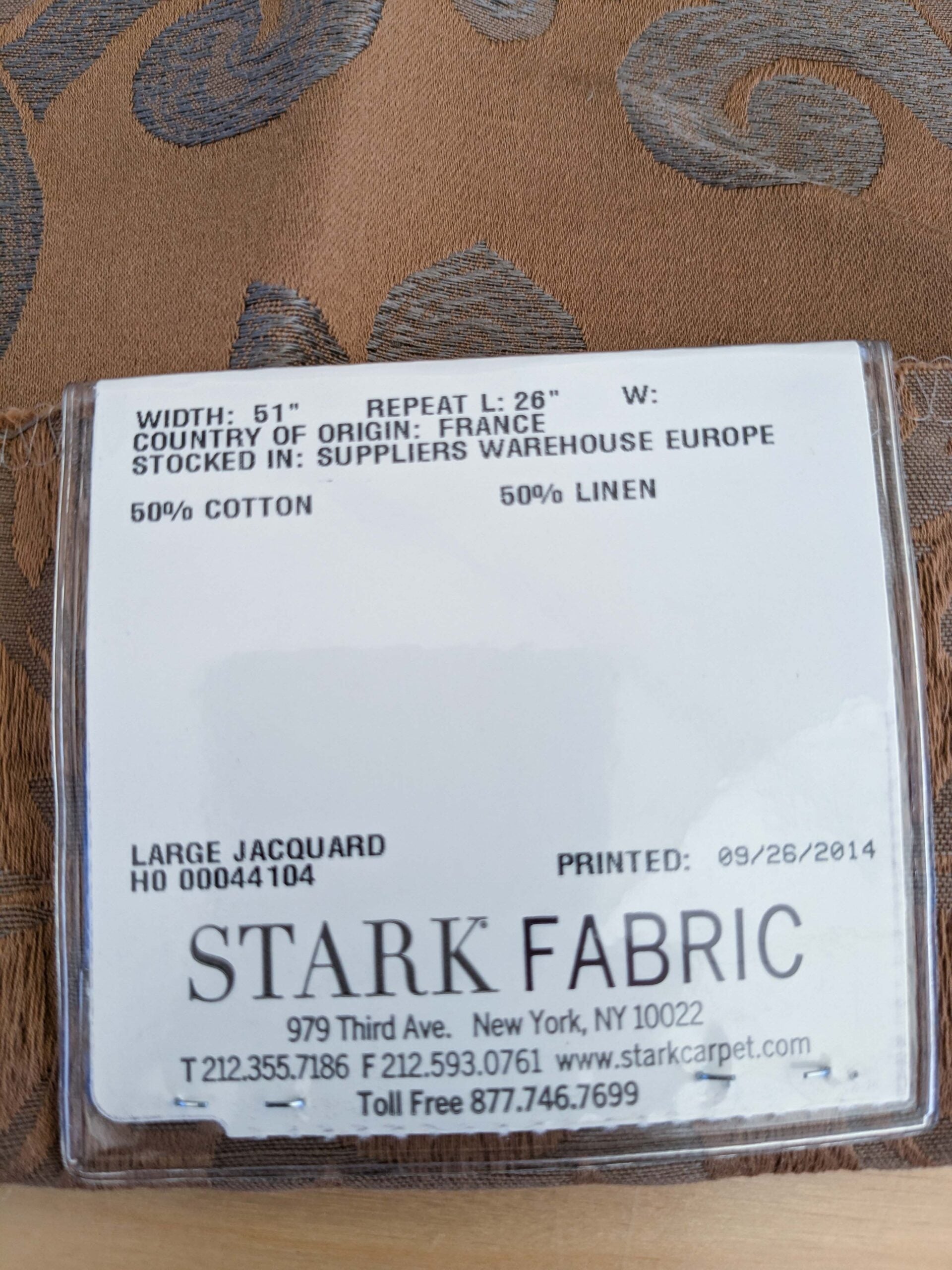 Fiber, repeat, width, weight, country of origin, WHOLESALE price/yard: