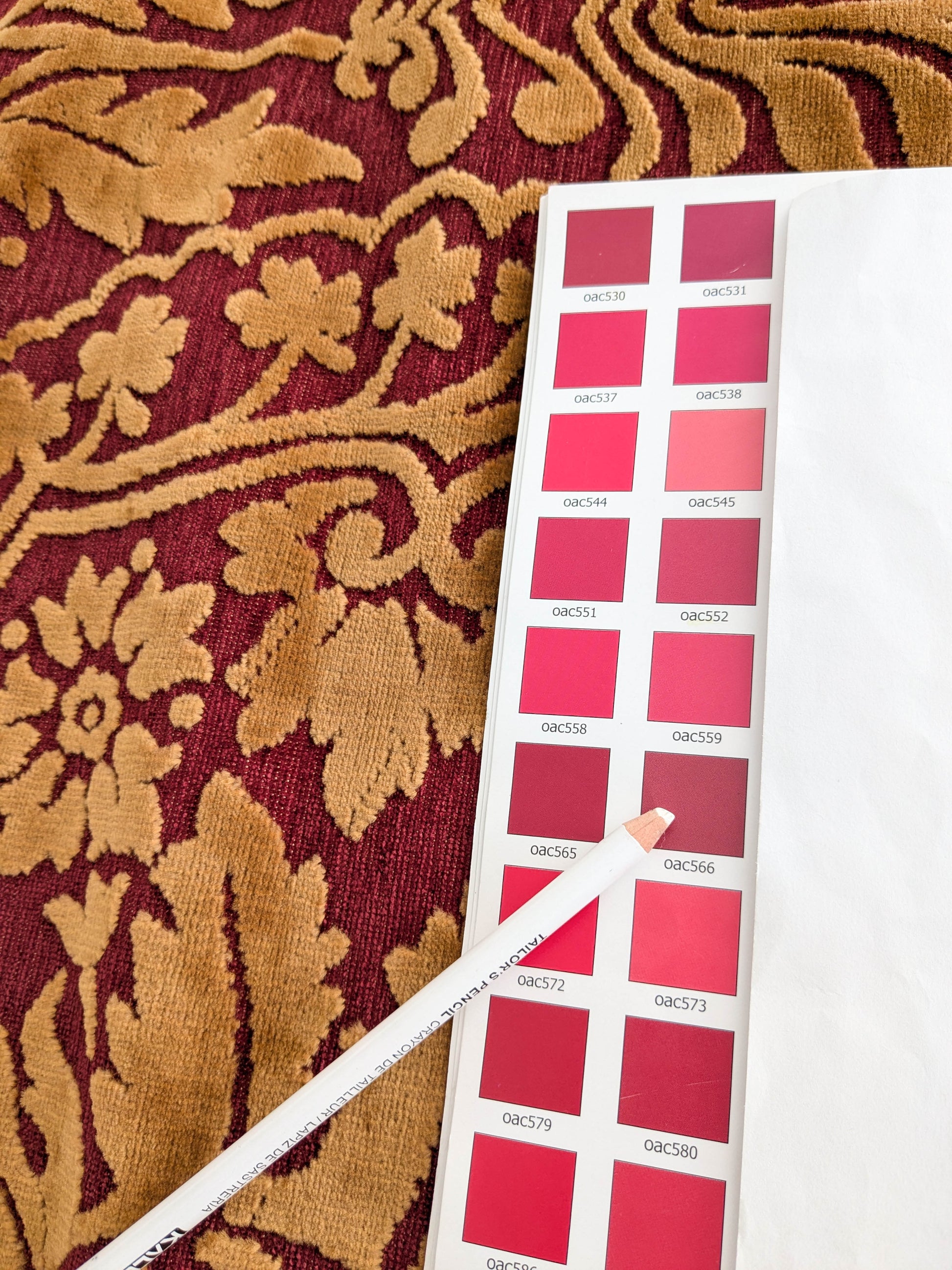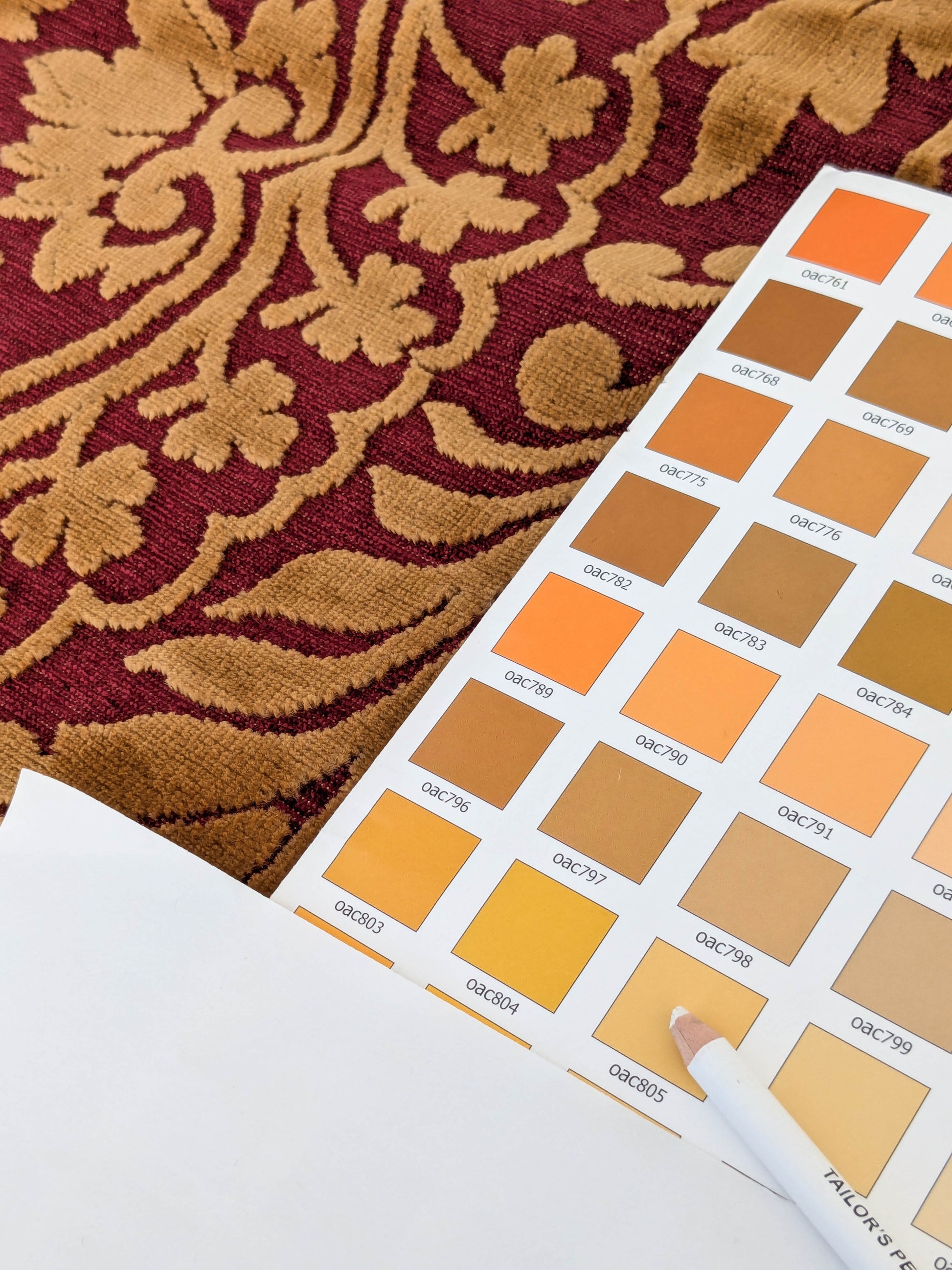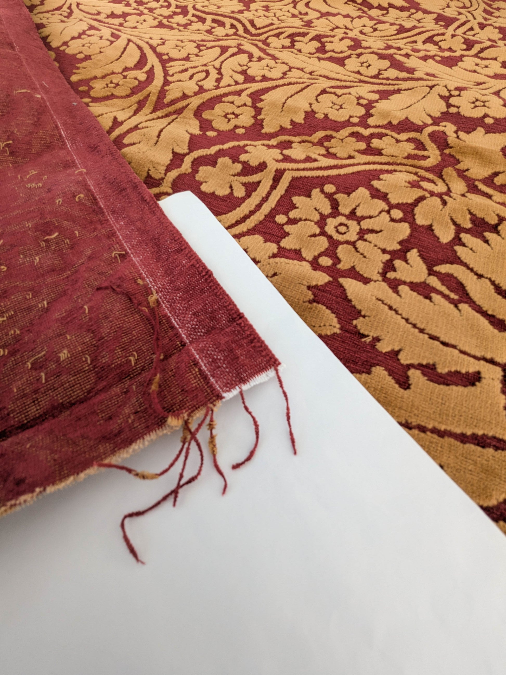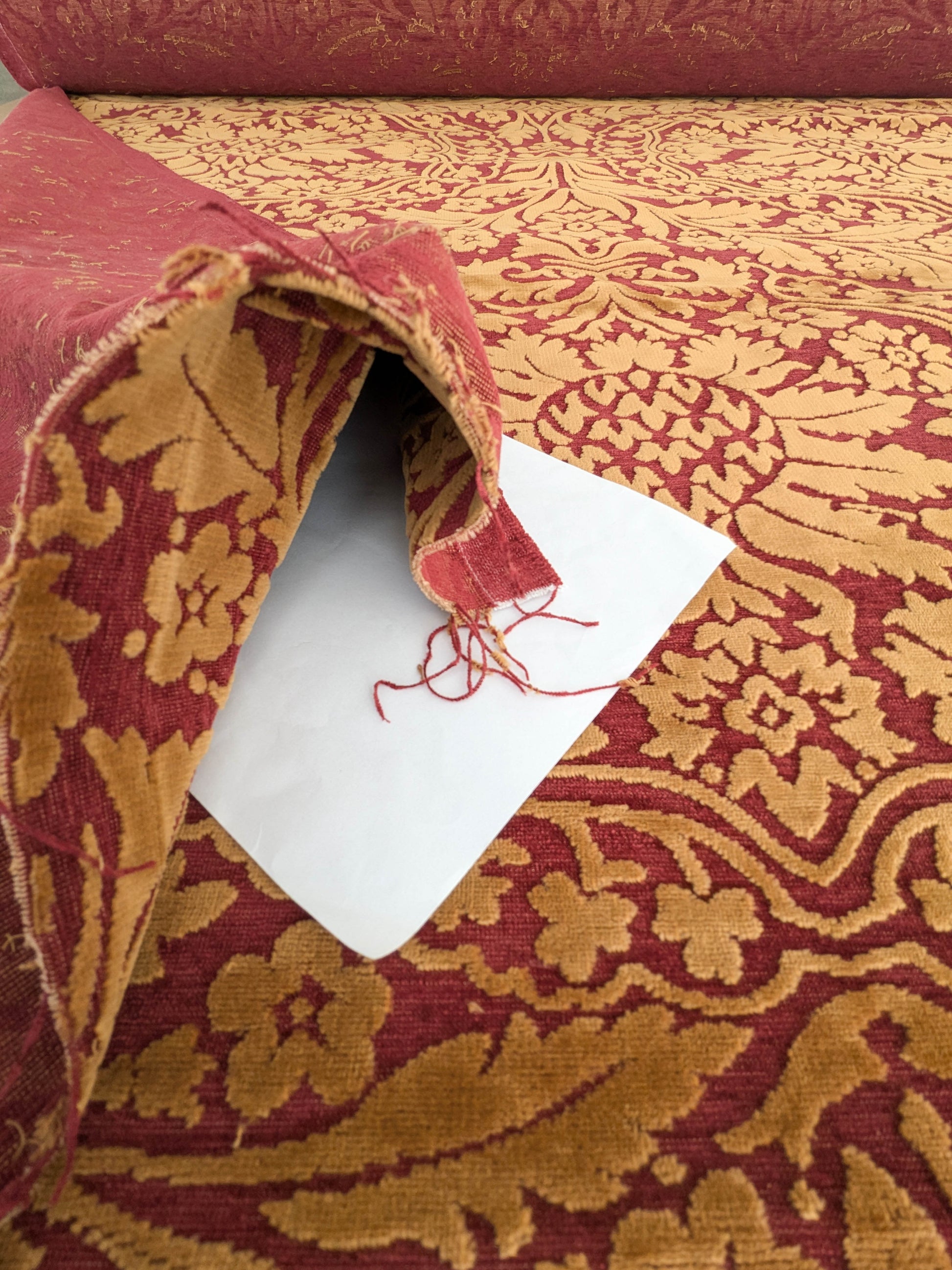 This cut velvet is a fine example. Large scale yet elegant and balanced, the artichoke forms a symmetric medallion surrounded by vines and acanthus. The silky hand and substantial weight makes it suitable for both drapery and upholstery.