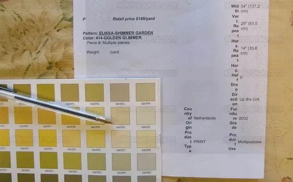 Fiber, repeat, width, weight, country of origin, retail price/yard:
