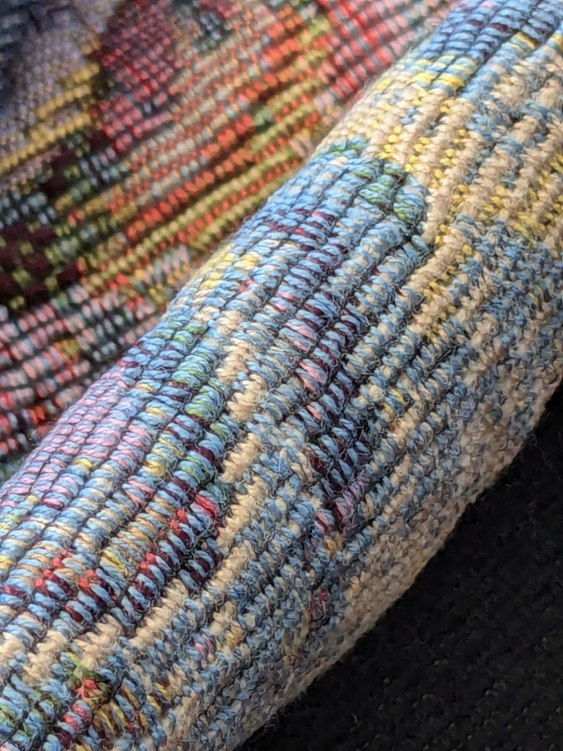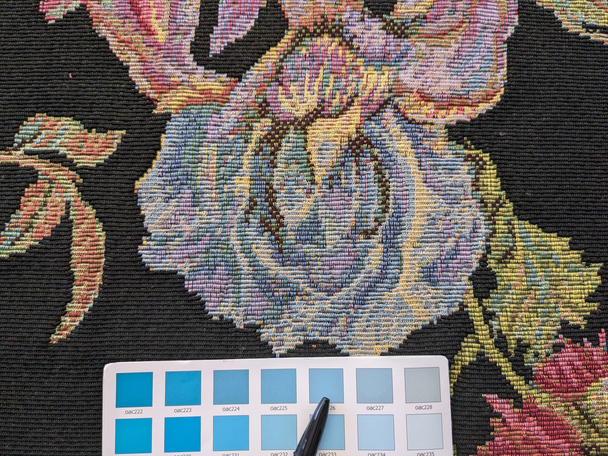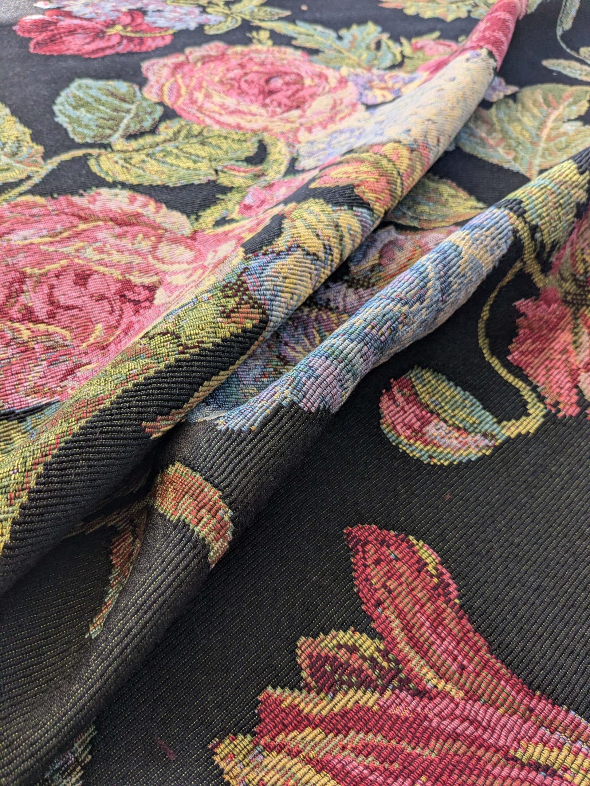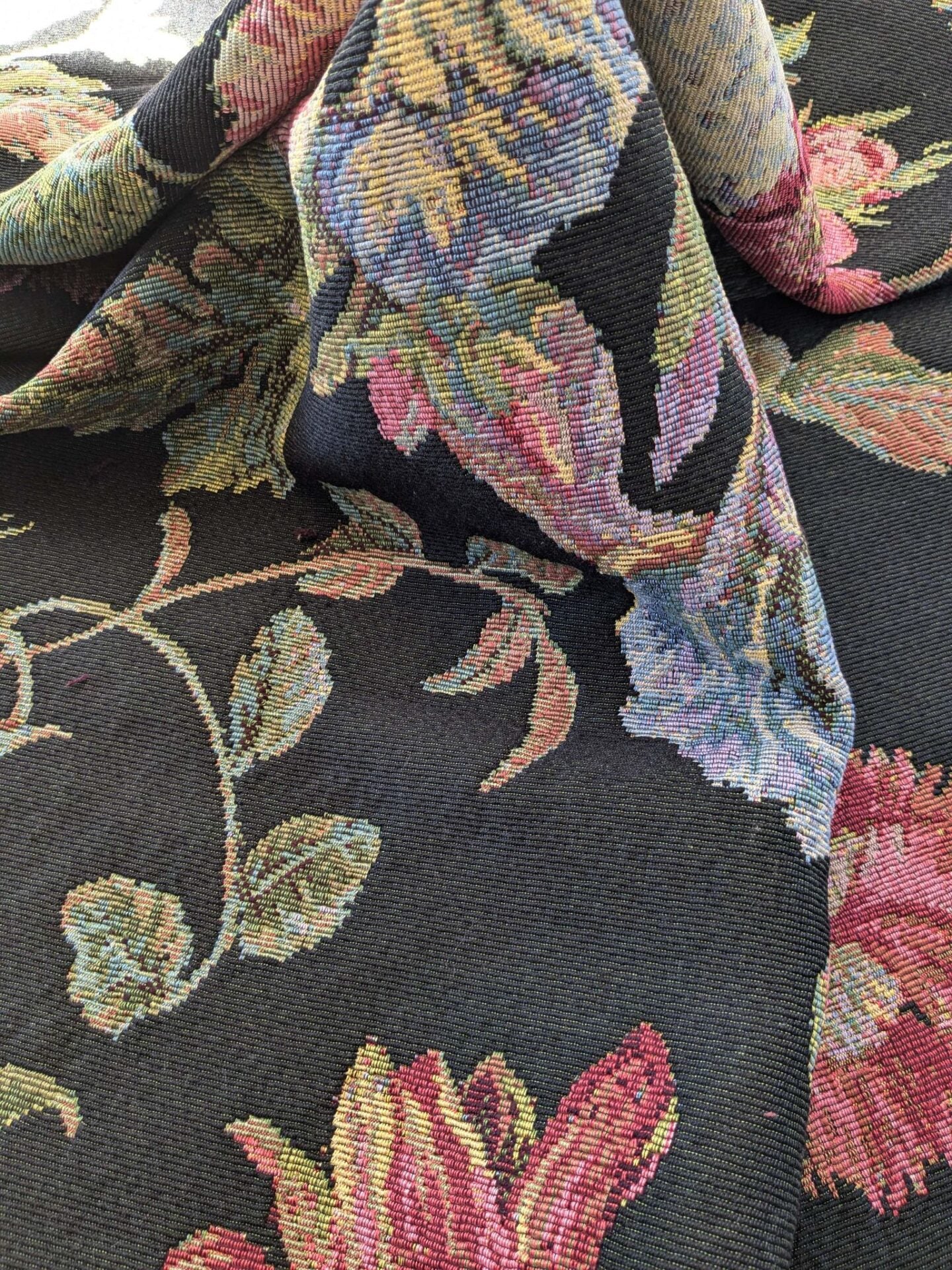 Red and pink rose, purple iris, pink tulips, pale blue hydrangea. All the Flowers bloom freely on a Black background. Very Heavy! Tapestry of such quality retails for about $500/yard now.