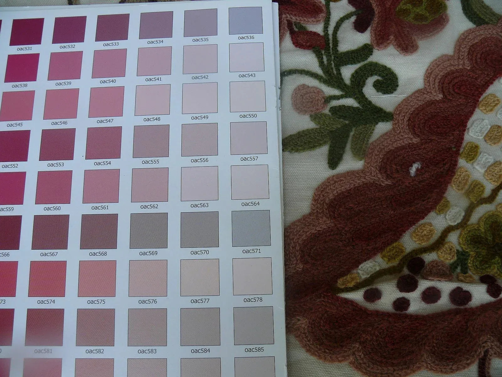 Color: Background is natural (not white). Crewel in pink, burgundy, gold, pale pink, brown, beige, grey (many colors).