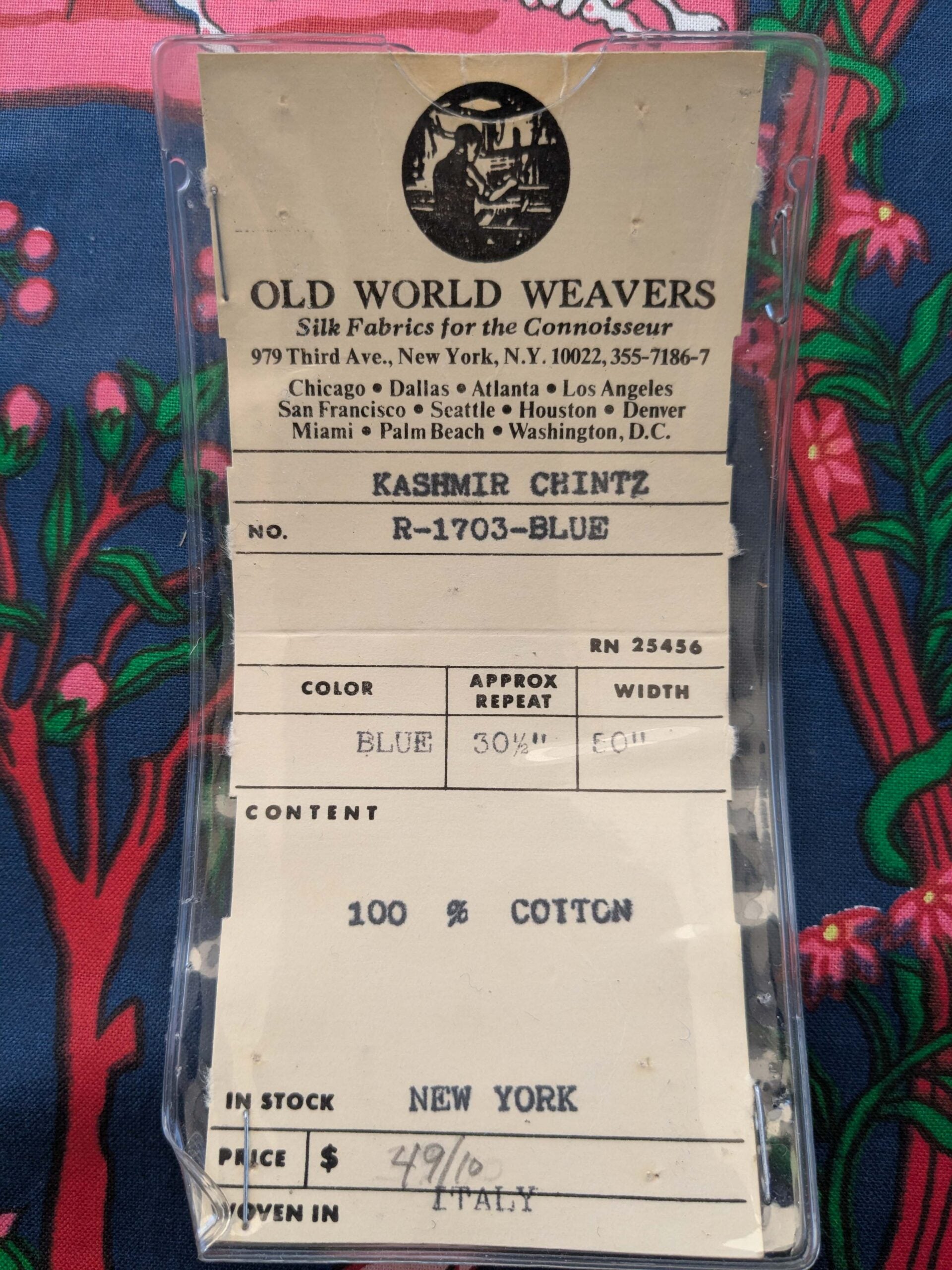 Color, repeat, fiber content, applications & retail price: please see the printout in photo.