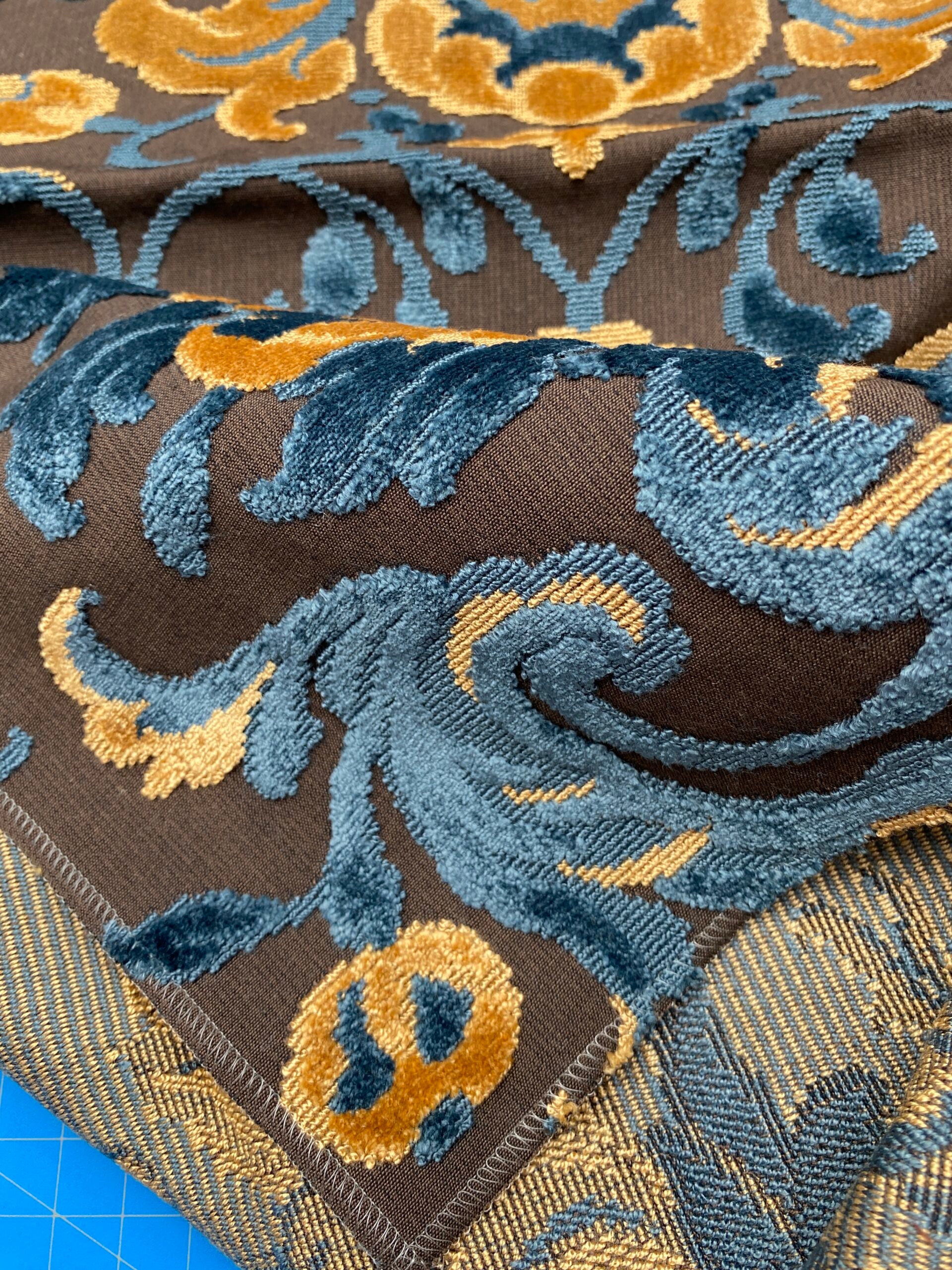 2 Berkbox80 Square Velvet by Grey Watkins Cherbourg Blue Brown Gold Botanical Foliage 26"x26" MSRP USD300+/y