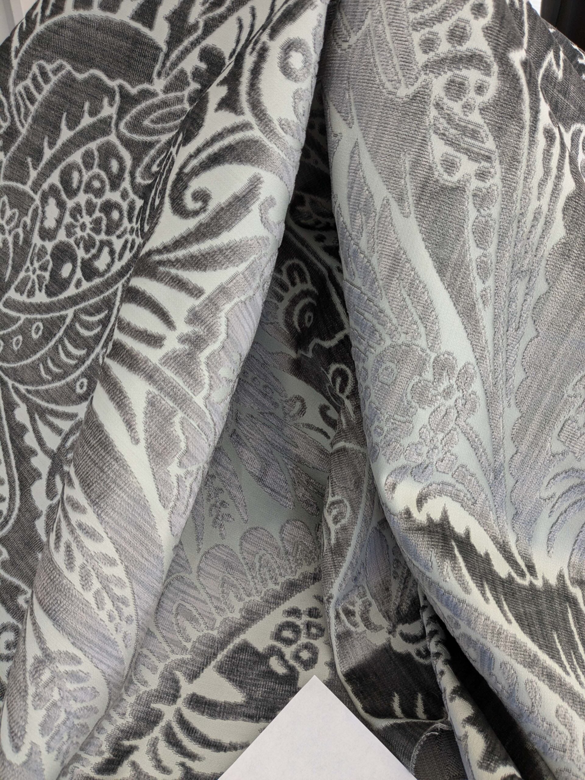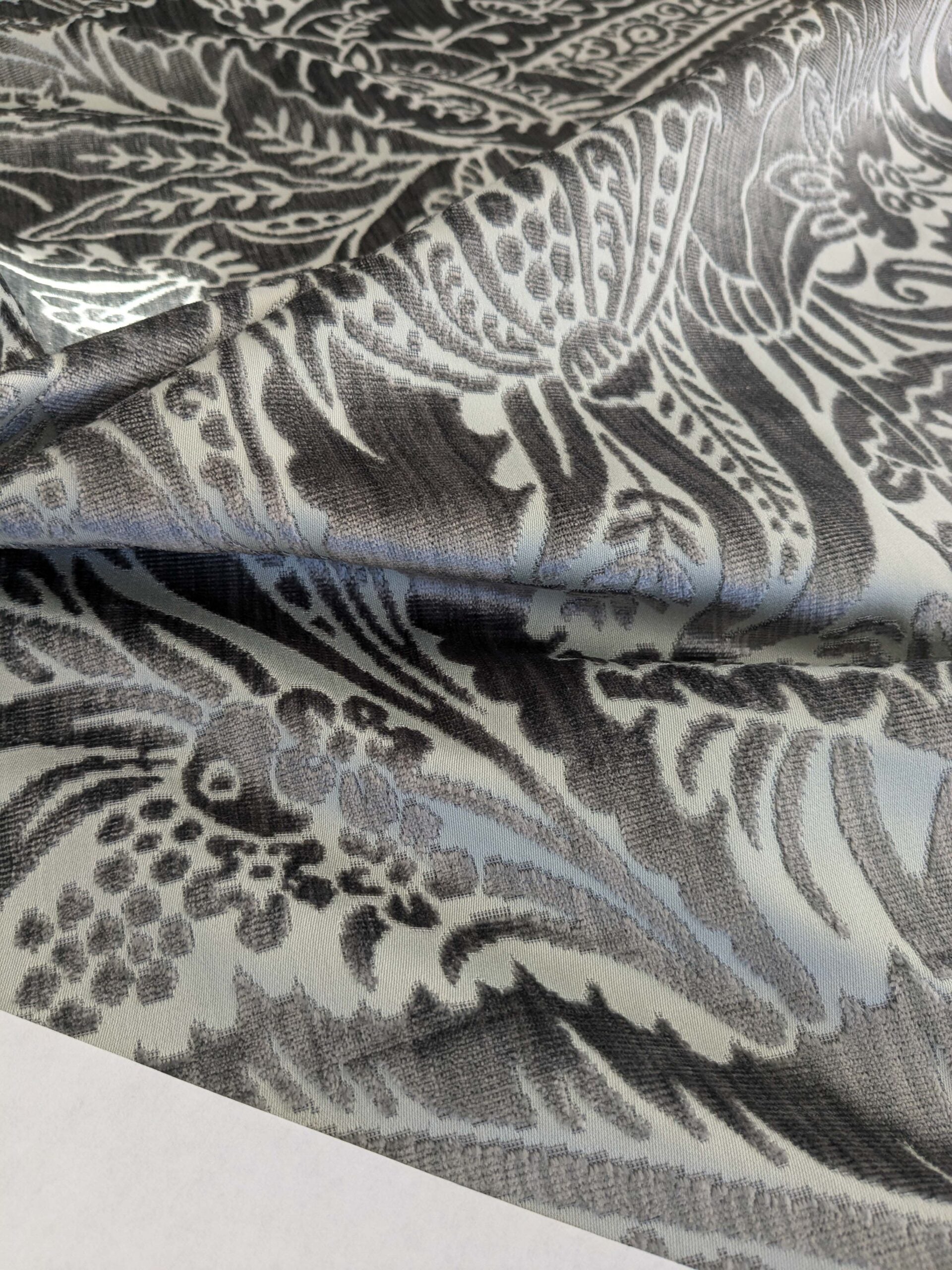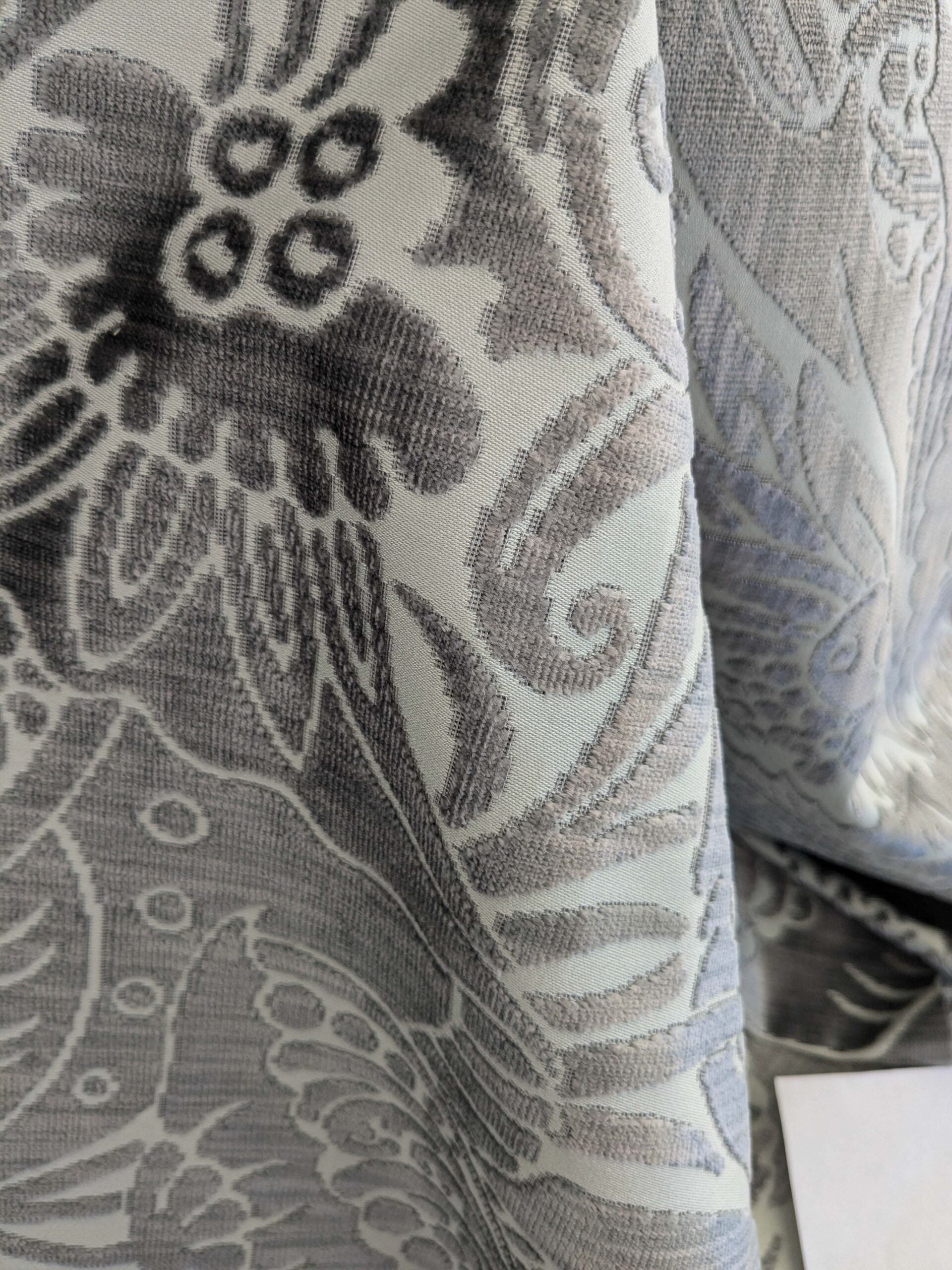 Grand botanical in dynamic movement, Welwyn by Old World Weavers is pure luxury with a michievous touch. 100% silk pile and 100% cotton base, this cut velvet captures lights in almost a magical way. The grand scale (VR 58.5″) commands attention in any space. At 1.25lb/yard, it suits both drapery and upholstery.