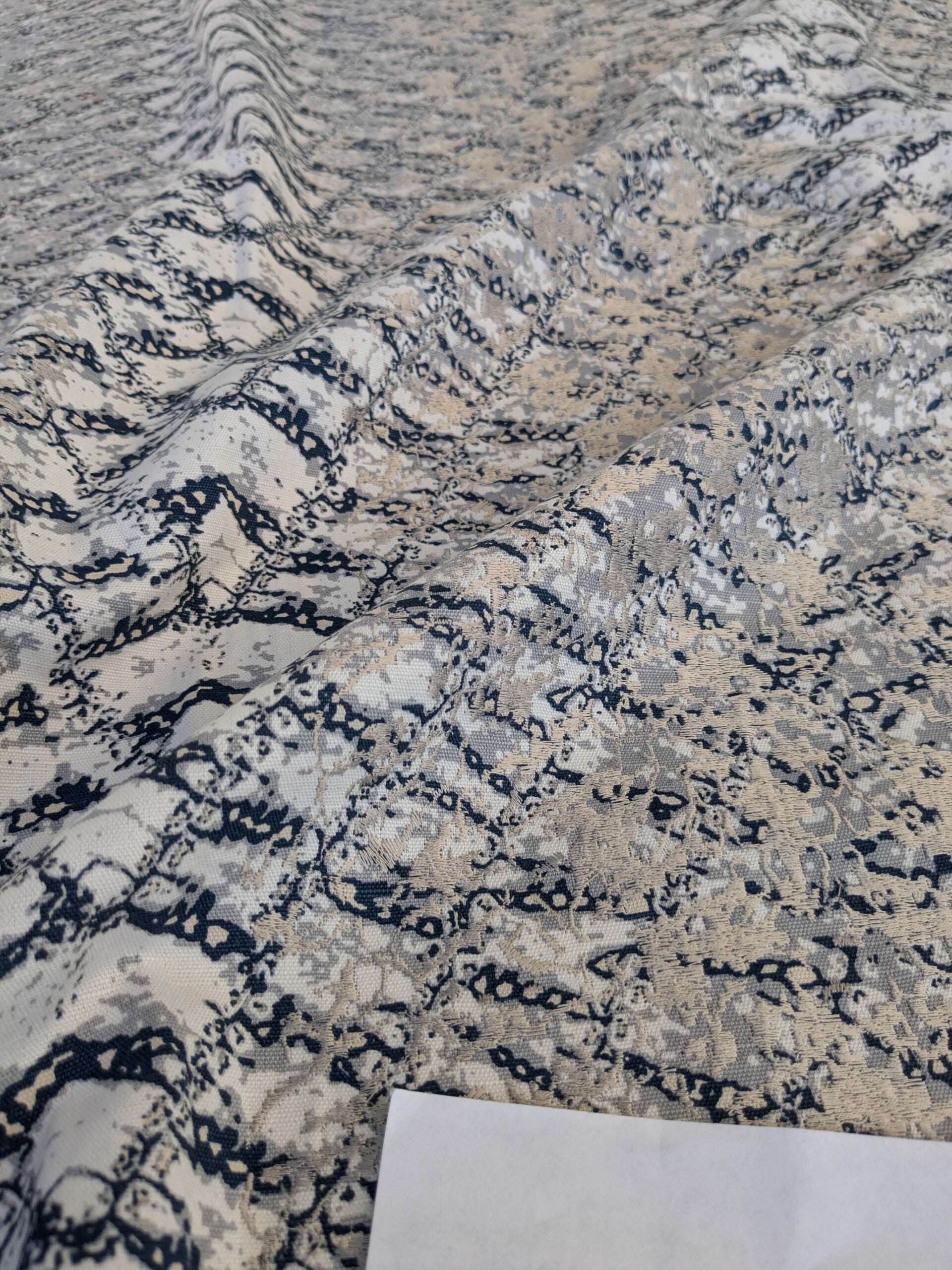 Named after the exotic dragon, Komodo is a modern take on a lizard skin pattern. Hand printed on a cotton and linen ground, the abstract design is overlaid with viscose embroidery that provides a touch of subtle shimmer and texture. The neutral and natural color palette is perfect for modern spaces, as curtains, pillows and light upholstery applications.