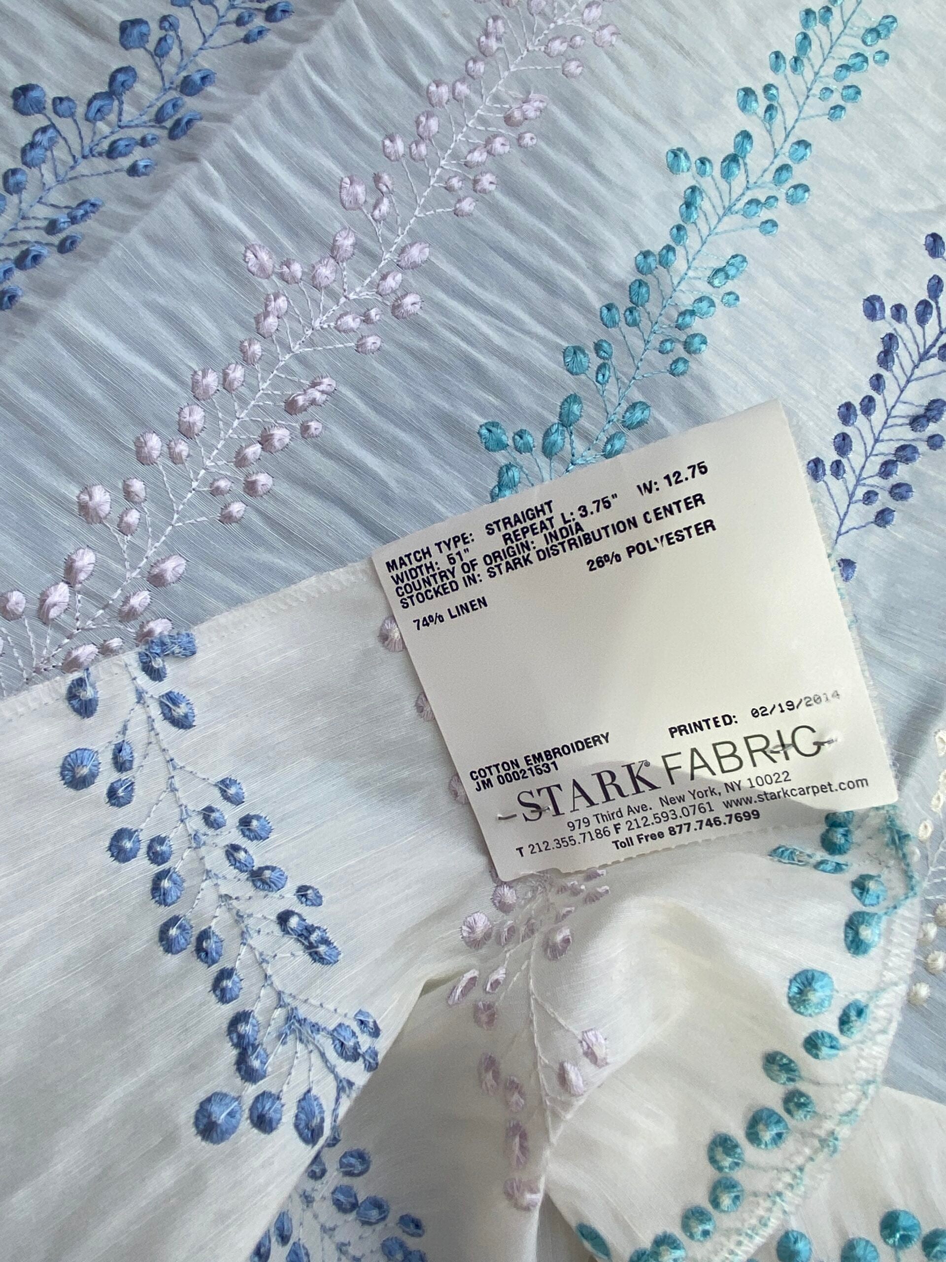 21 Berkbox75 Square Embroidery by Old World Weavers Tendrils Delphinium Blue on White Linen Embroidered Leaf Dot Stripe MSRP USD 300+/Y