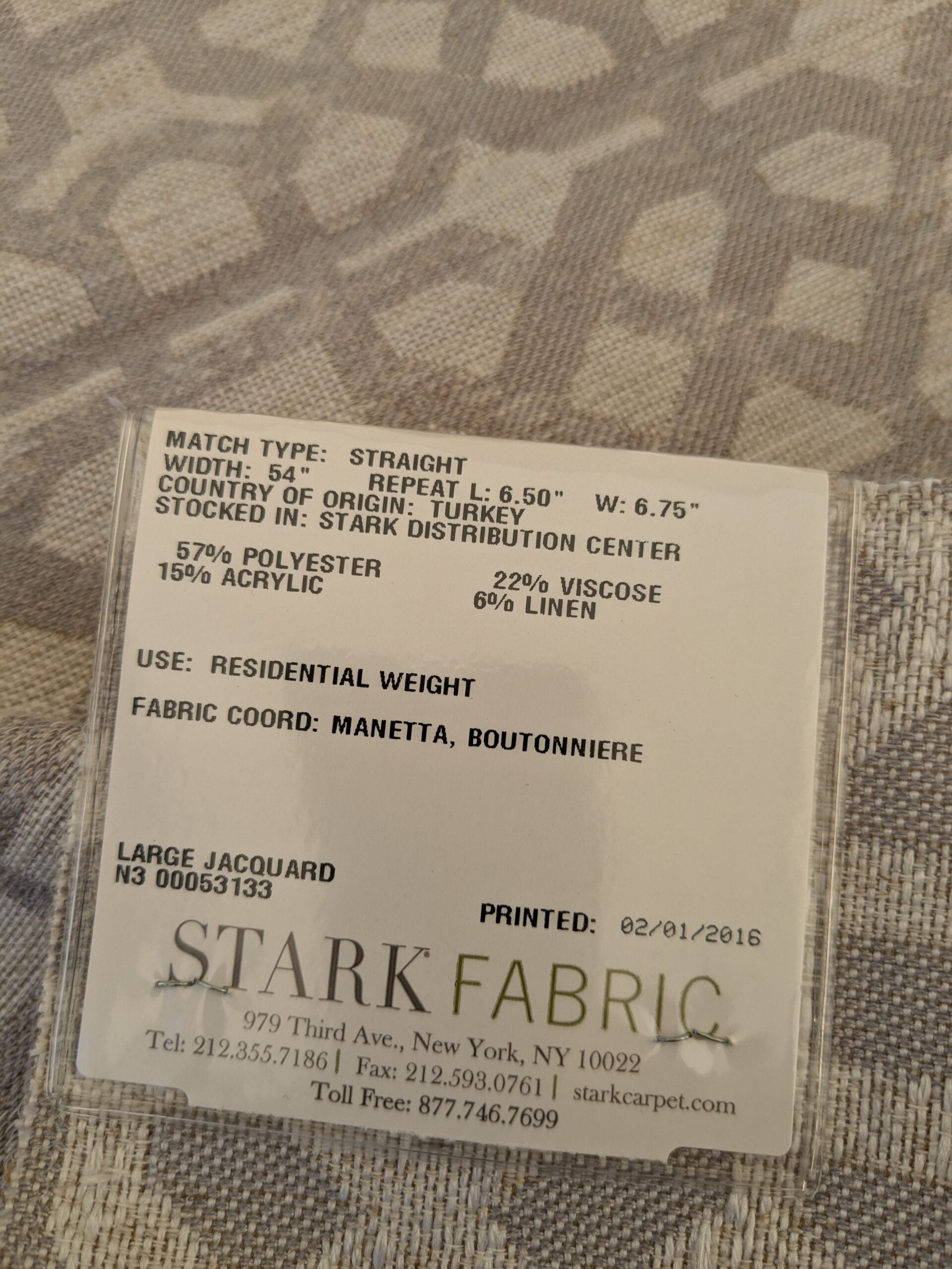 Fiber, repeat, width, weight, country of origin, WHOLESALE price/yard: