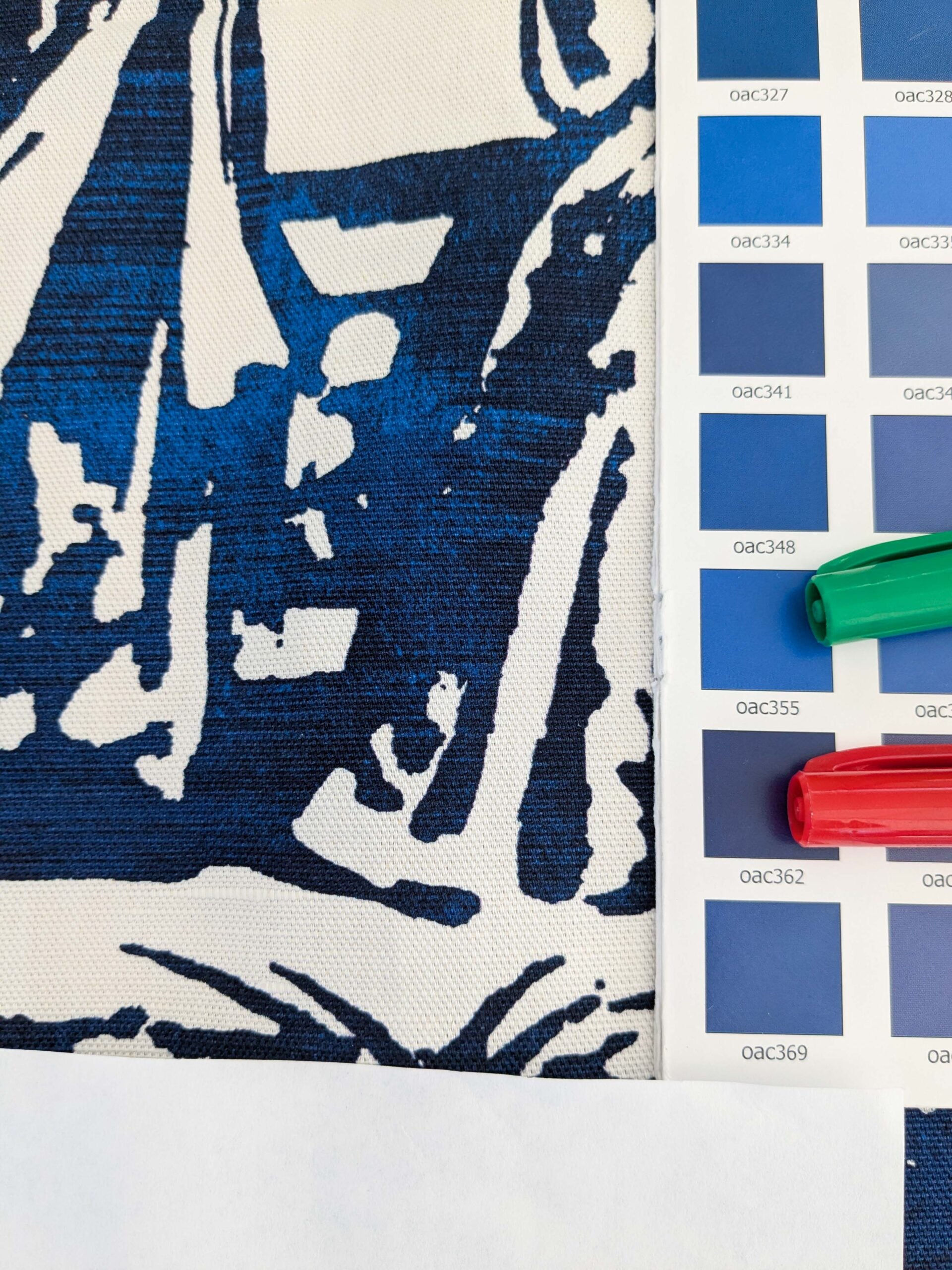 blue. Light grounds complement the dramatic, dark hued fabrics.