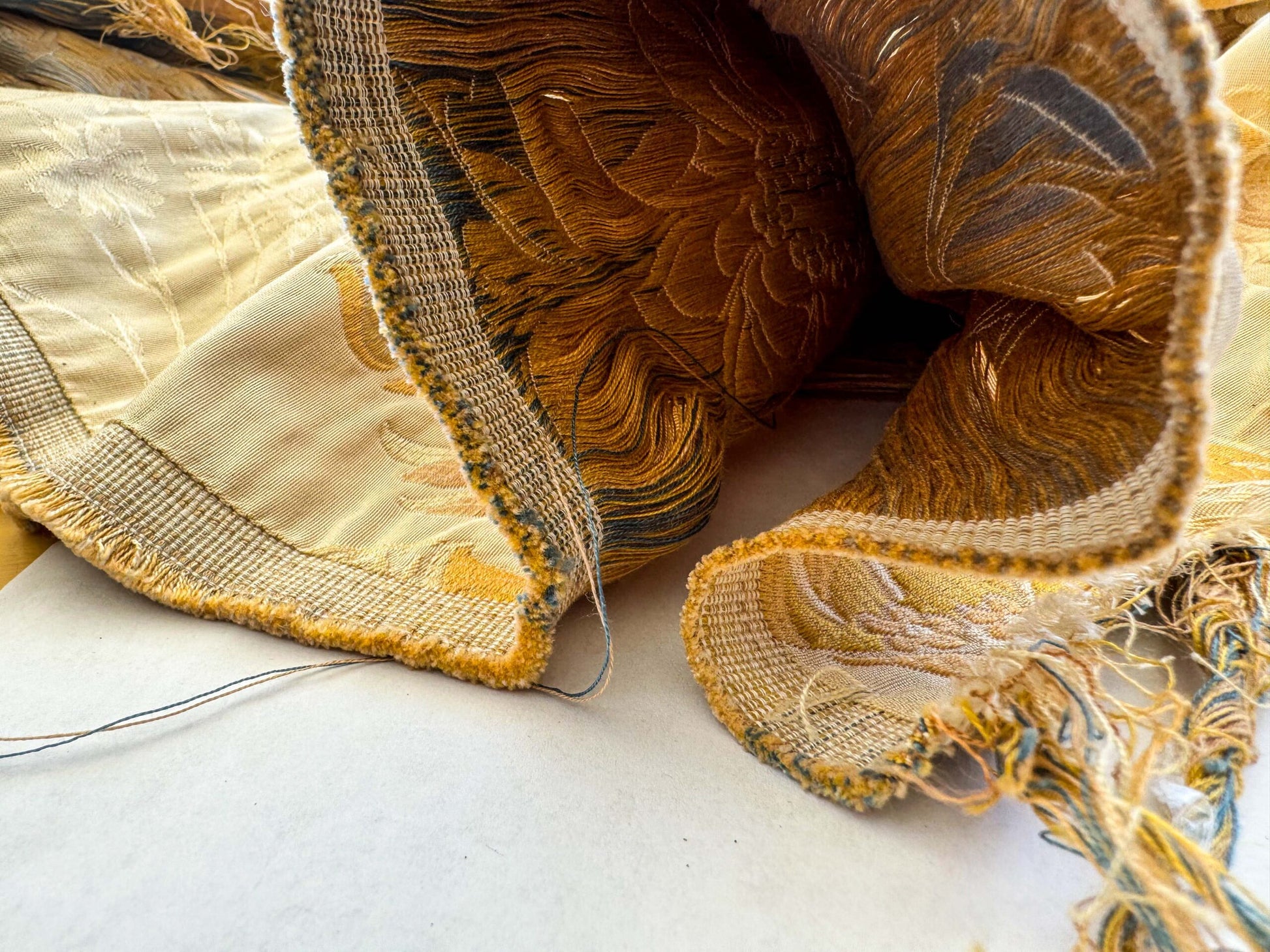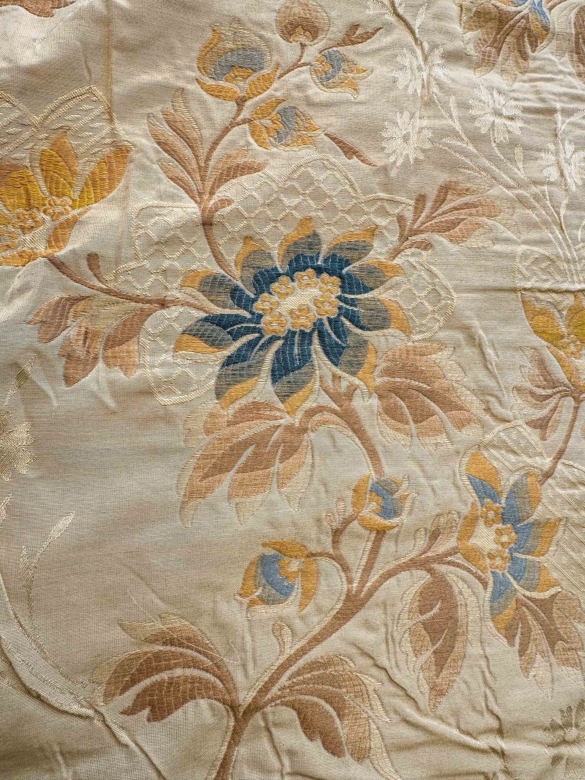 Weight: medium heavy weight silk damask. About 0.5lb/yard. Soft, yet durable enough for upholstery purpose