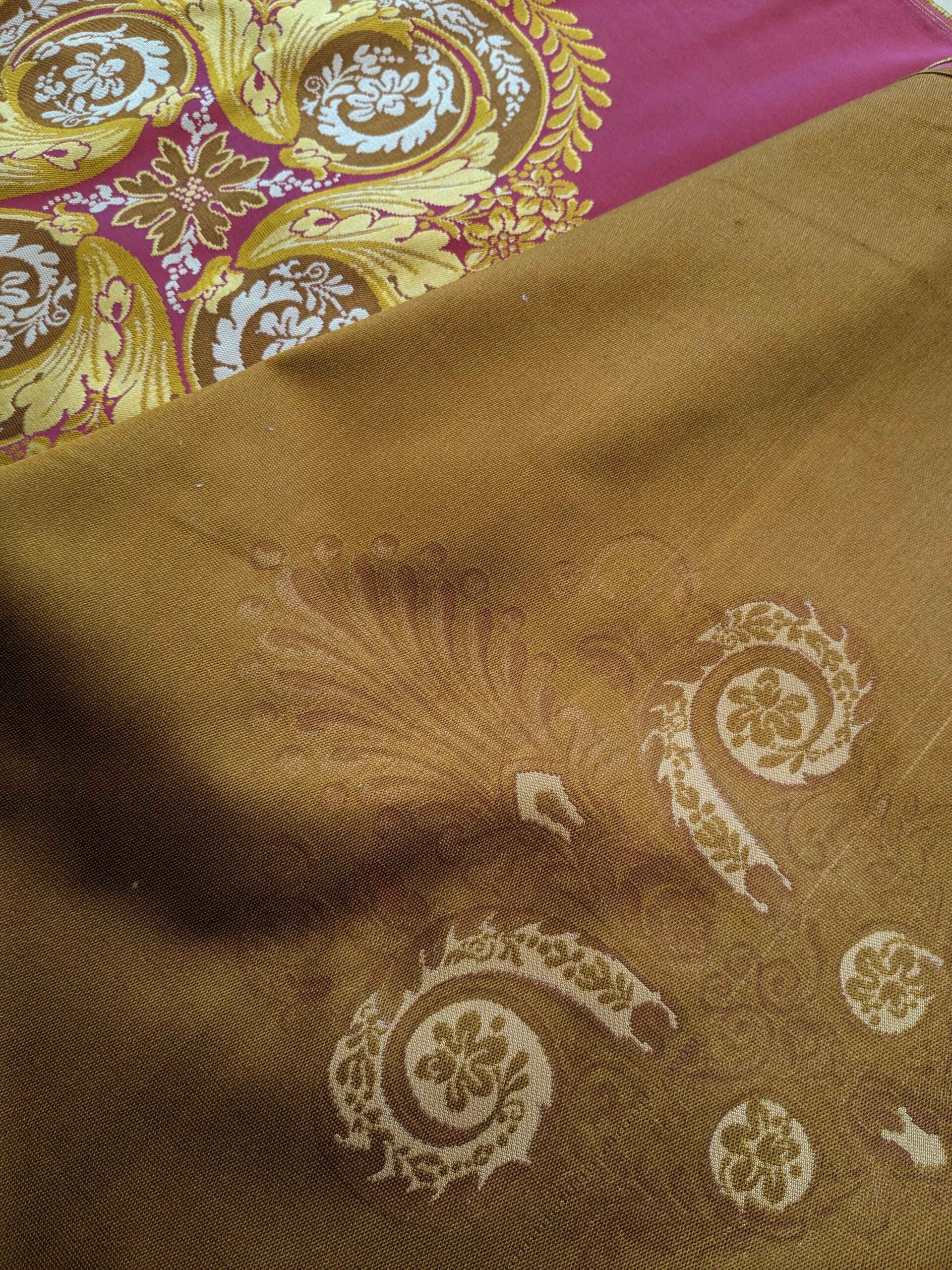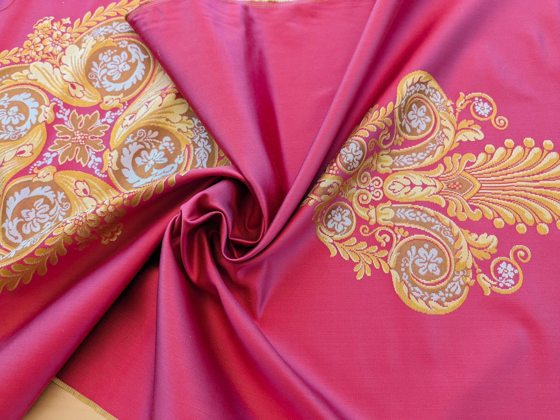 | This silk lampas is made for antique French armcharis. Rich and intricate medallion designs in 100% silk. For each vertical repeat, you get back cover and seat cover for 2 charis. |