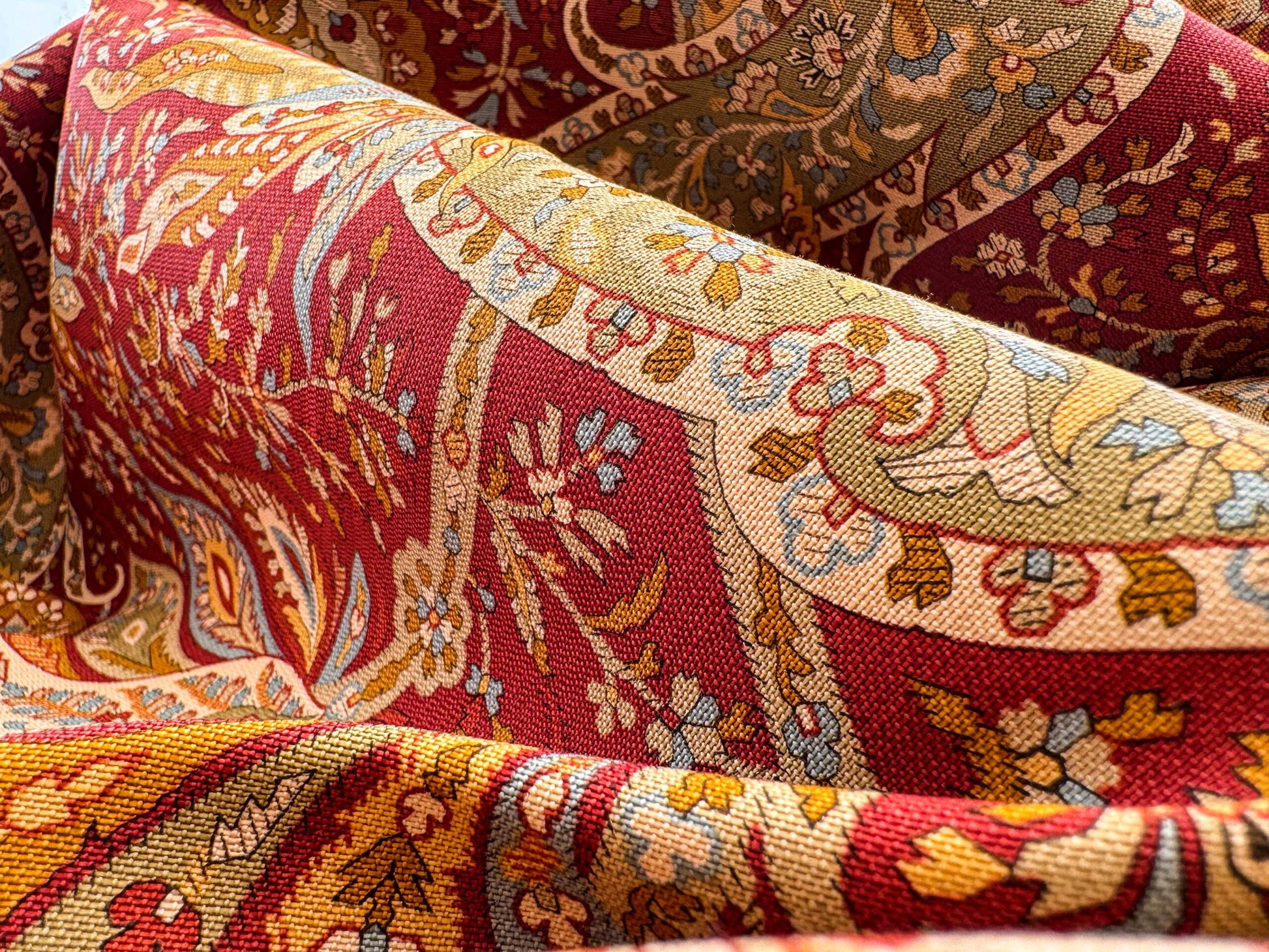 Weight: medium heavy weight silk damask. About 0.5lb/yard. Soft, yet durable enough for upholstery purpose