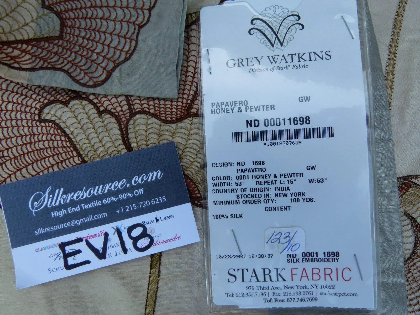 3 Ev18 Scalamandre 2.1y Papavero Honey And Pewter Silk Large Poppy Flowers Floral Stripe Embroidered Blue Beige Gold