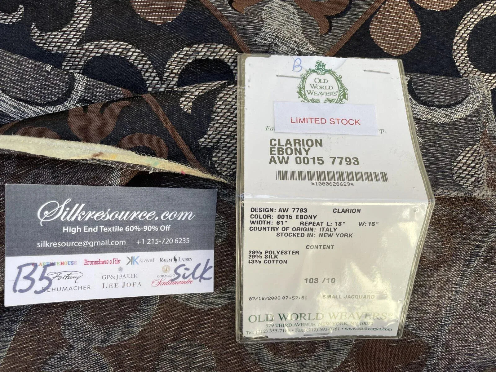 Fiber, repeat, width, weight, country of origin, WHOLESALE price/yard: