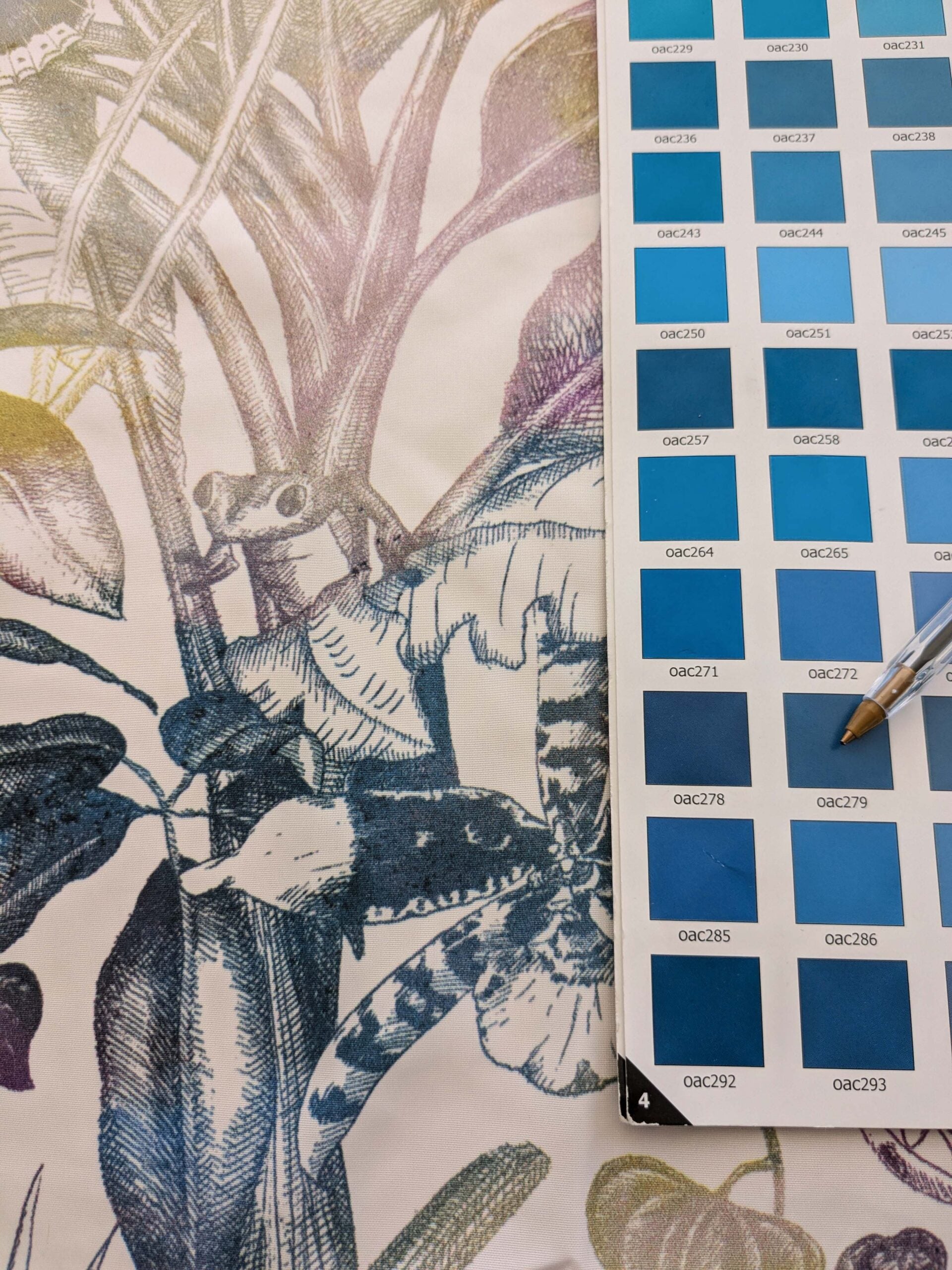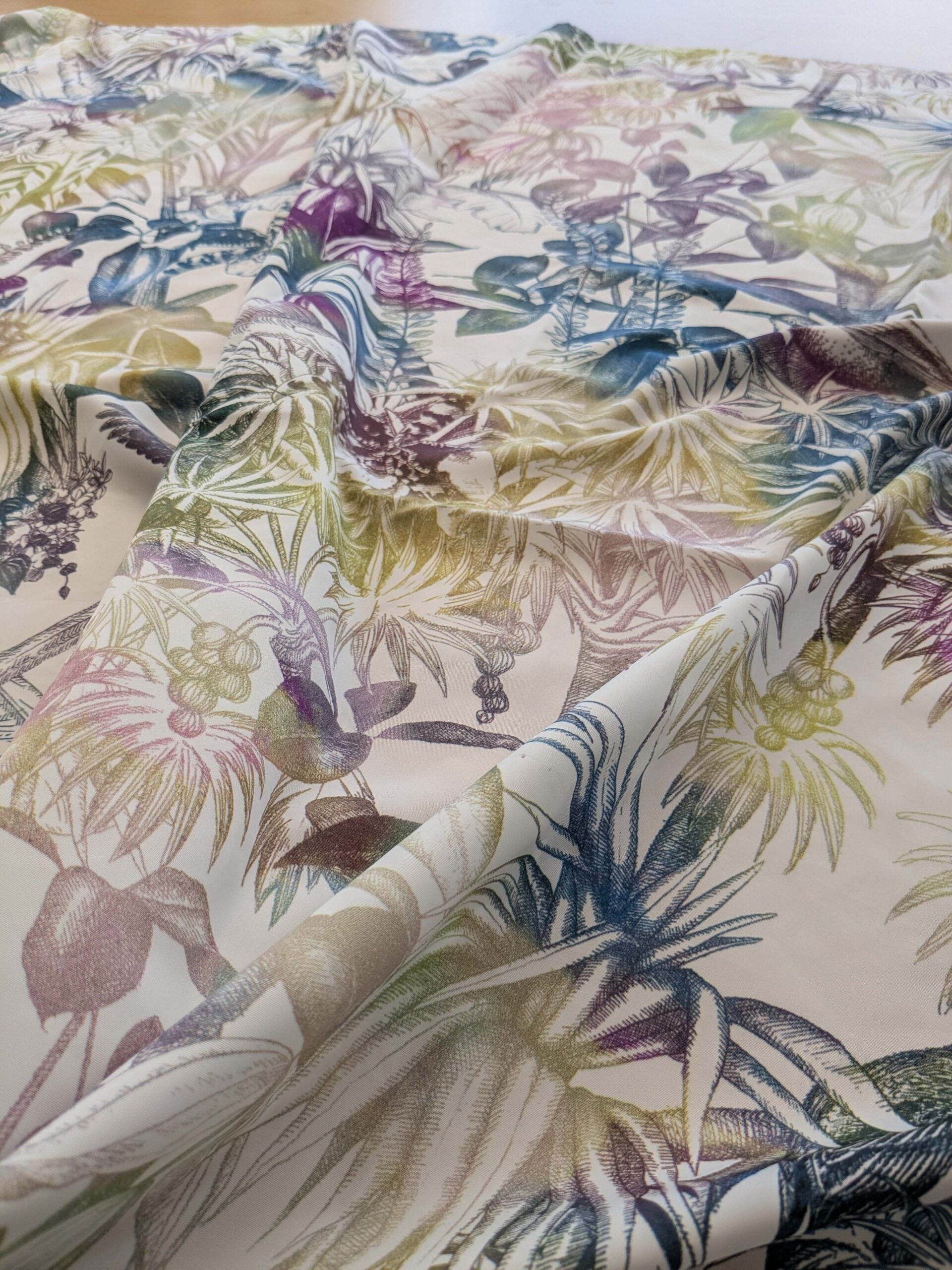 The exotic jungle motif of Benu Splash was hand-drawn in Christian Fischbacher’s design studio and superimposed on a watercolor. The colorful design is realized in France as an environmentally friendly inkjet print on a technically innovative decorative fabric made from recycled plastic PET bottles. Discarded plastic bottles are collected, crushed, melted down and spun into polyester filament yarns that are subsequently woven into the fabric. With Benu Splash, Christian Fischbacher has managed to unite sustainability with the highest aesthetic demands. All the fabrics in the Benu collection are made from recycled materials and are examples of sustainability and environmentally conscious production.