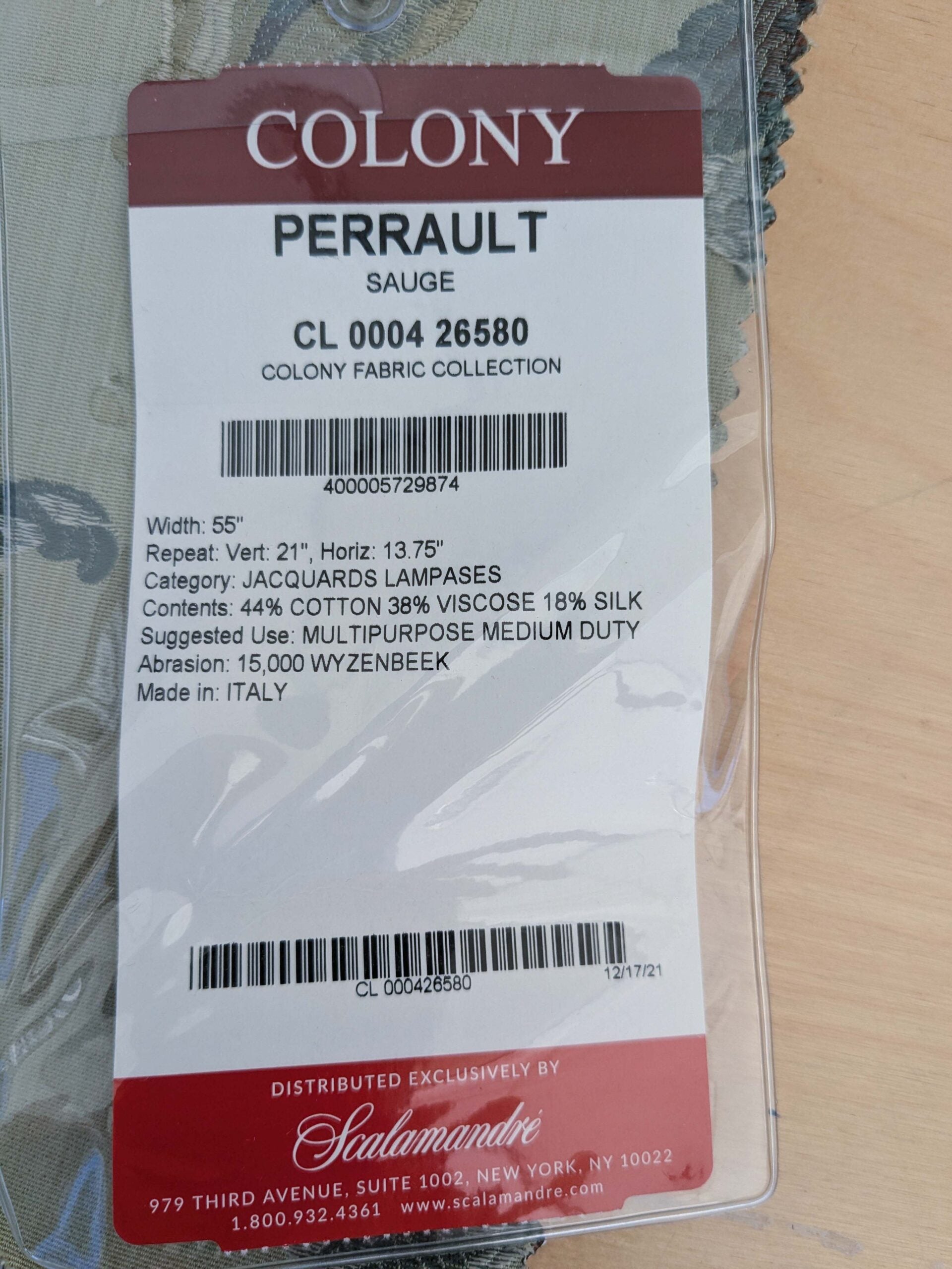 39 EV50 24" x 26" Scalamandre Perrault Sauge Silk lampas Green Fruits Foliage MSRP USD 690/y