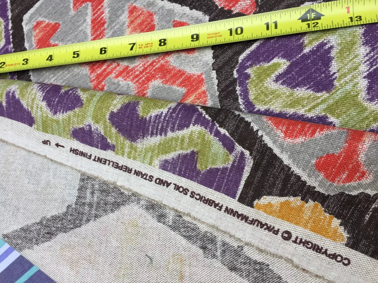 This medium-weight fabric features a vibrant Ikat Southwestern print in shades of purple, kiwi, orange, red, gold, fuchsia, teal, grey, and brown. Printed on a soft and durable cotton blend, it’s versatile and perfect for window treatments (draperies, curtains) toss pillows, and upholstery projects.