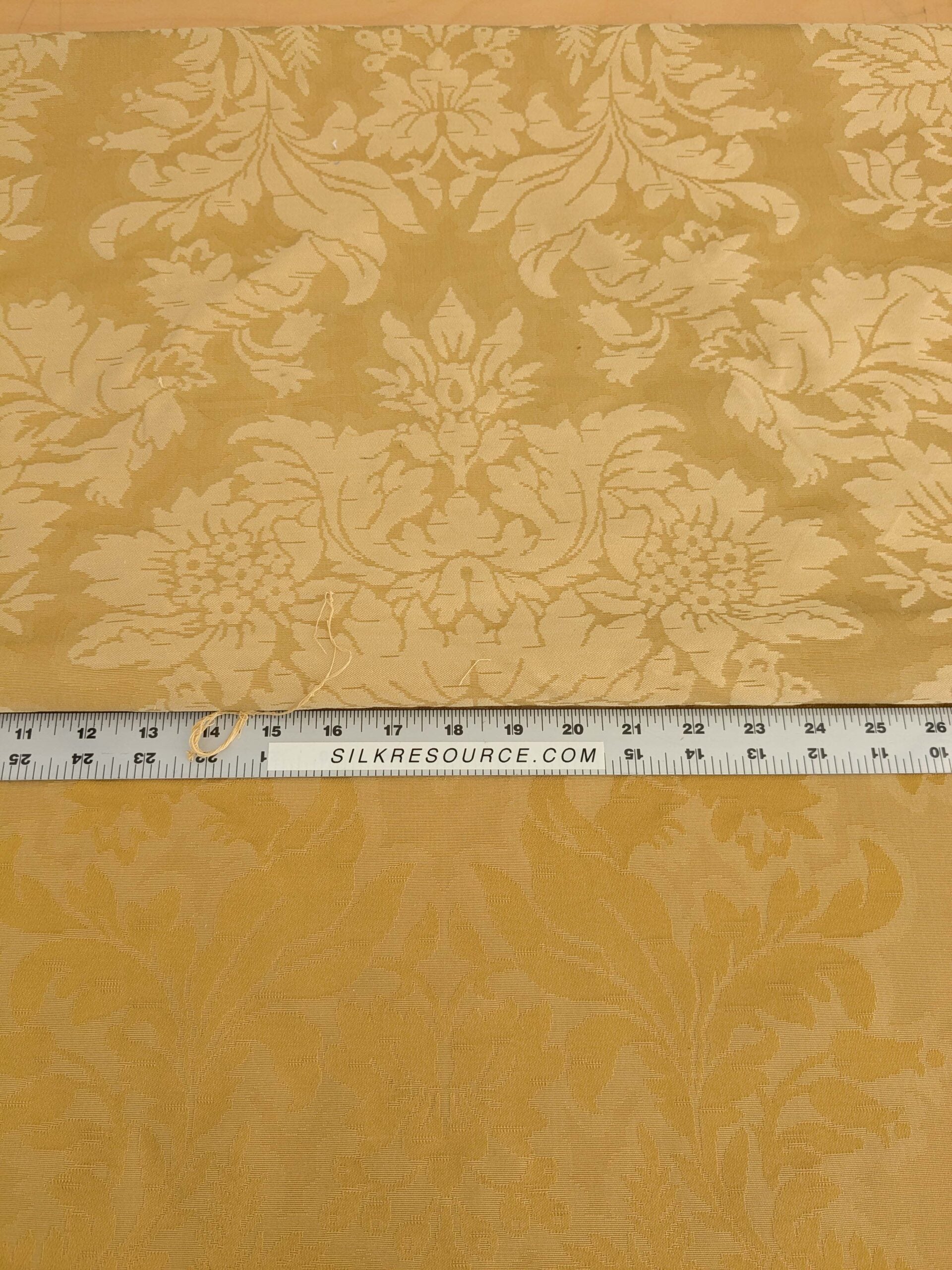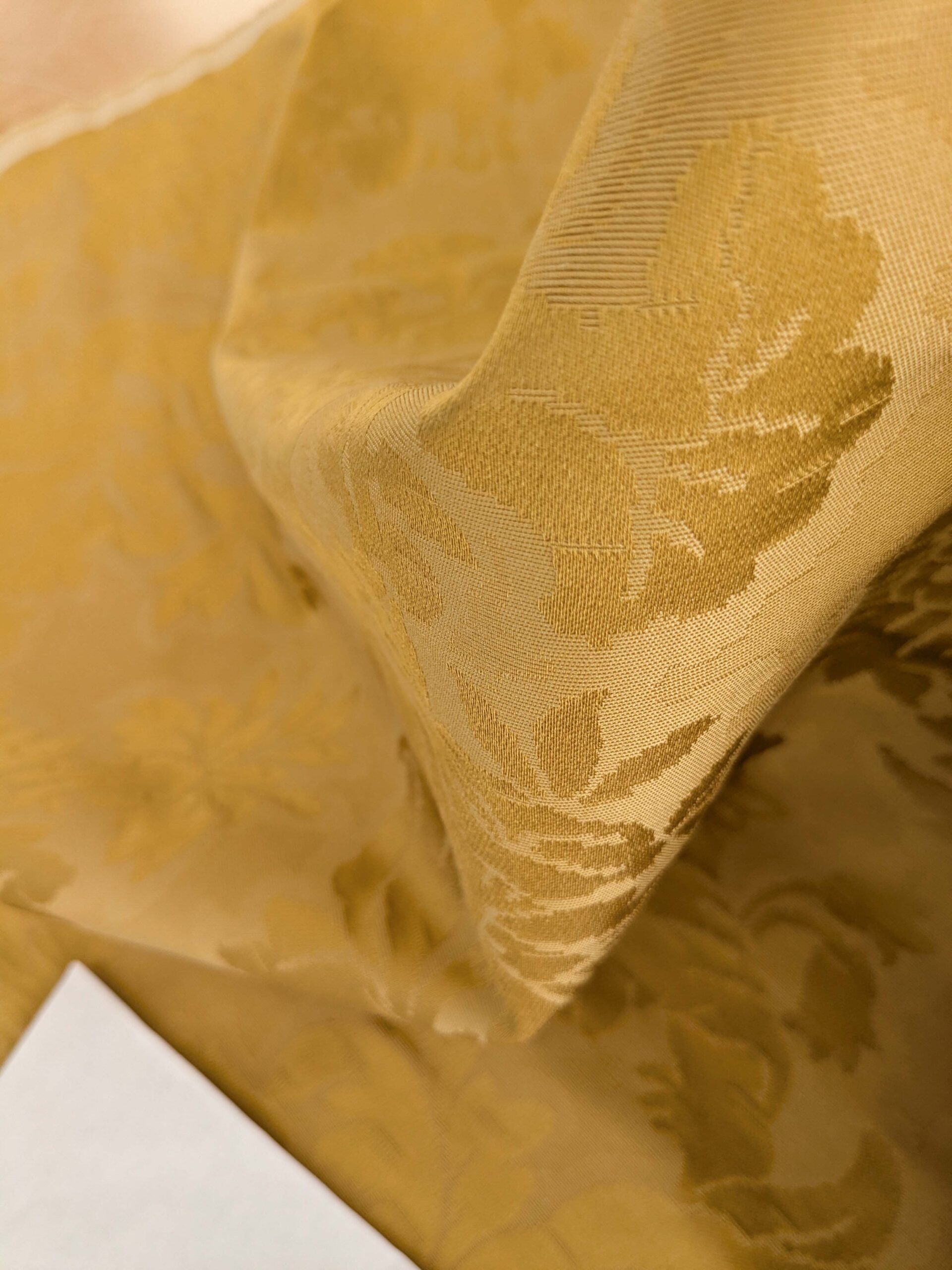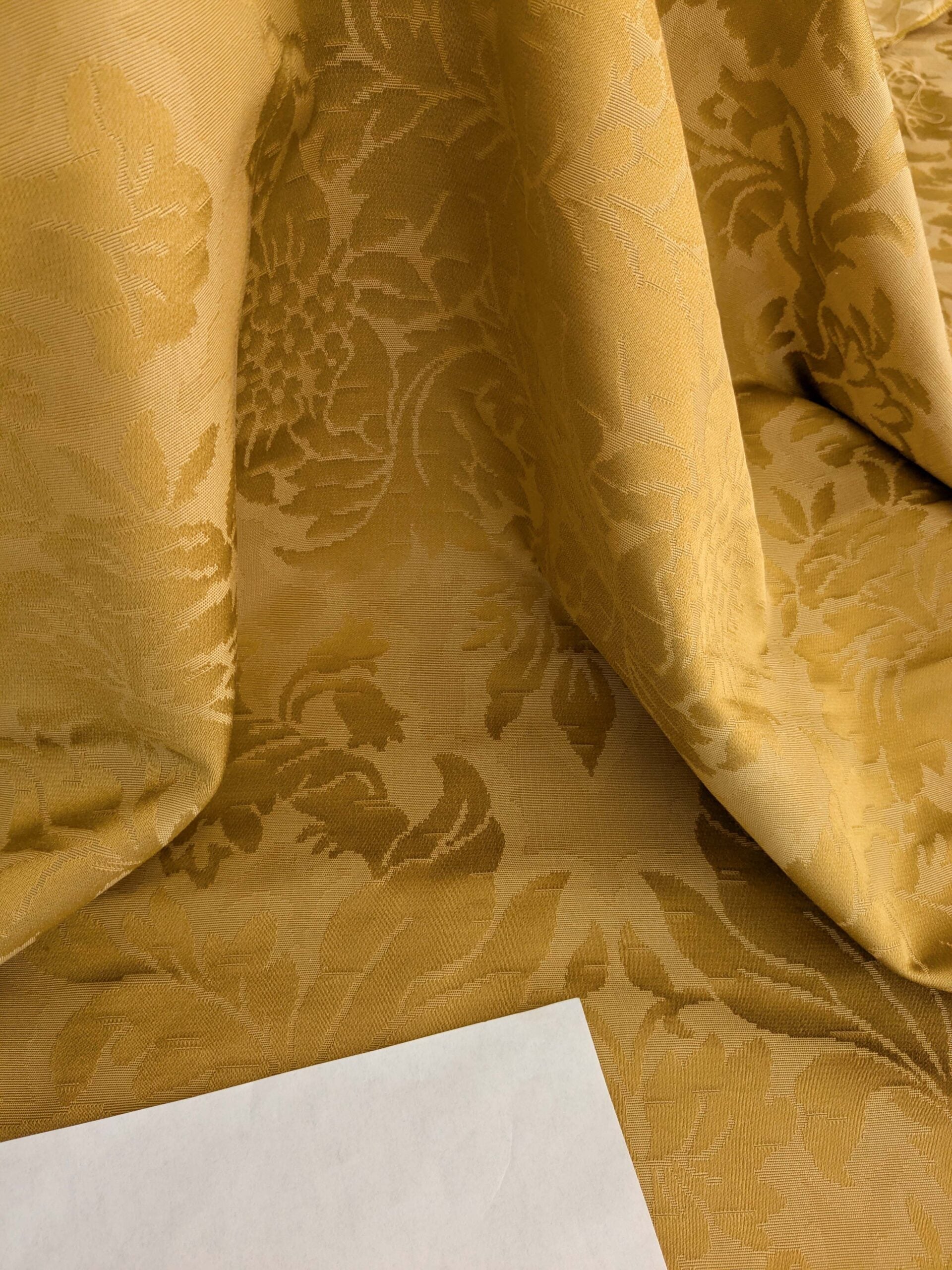 Please see yardage in title & photo. This radiant damask with extra width and silky hand will light up any room. Most likely a cotton or cotton and viscose blend, it features acanthus, rose and artichokes.